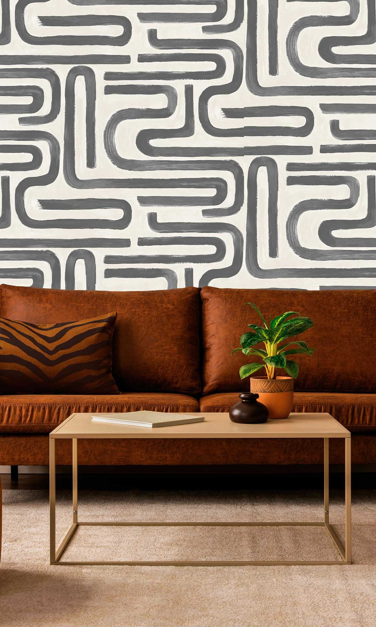 Charcoal Cream Painterly Geometric Maze Wallpaper R10085