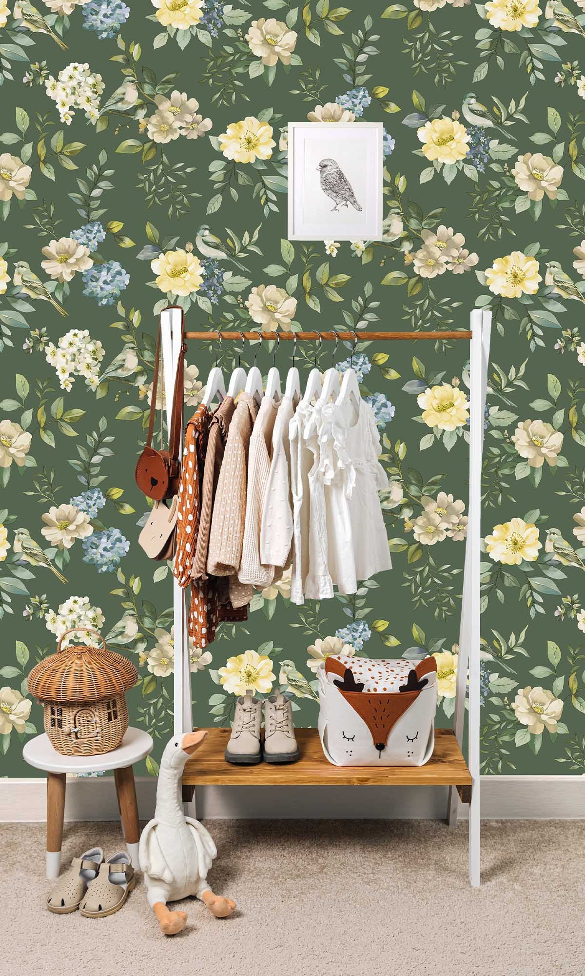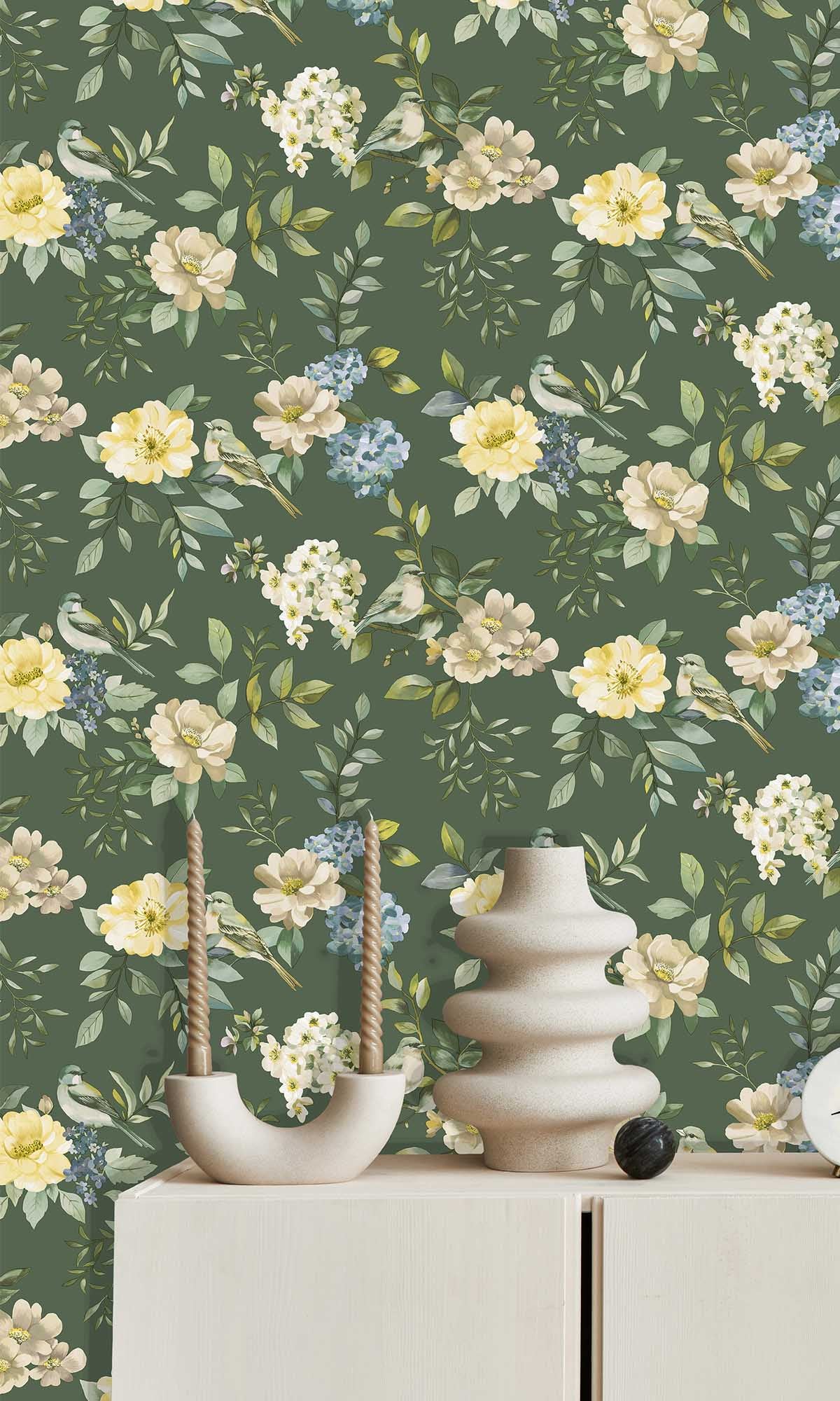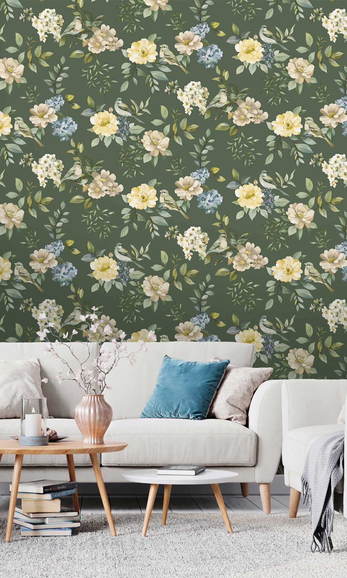 This Birds in a Garden wallpaper isn’t just decor—it’s like letting your walls throw a secret garden party. Imagine tiny birds gossiping in the petals, flowers bursting out in color like they just couldn’t help themselves, and all of it painted with that dreamy, artsy touch. The whole scene feels alive, like you might catch a petal falling or a bird stretching its wings if you blinked at the right moment.