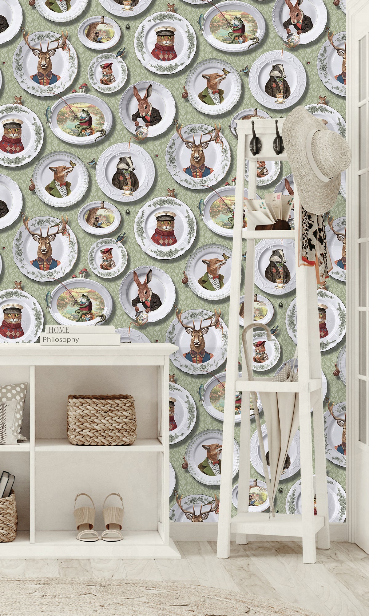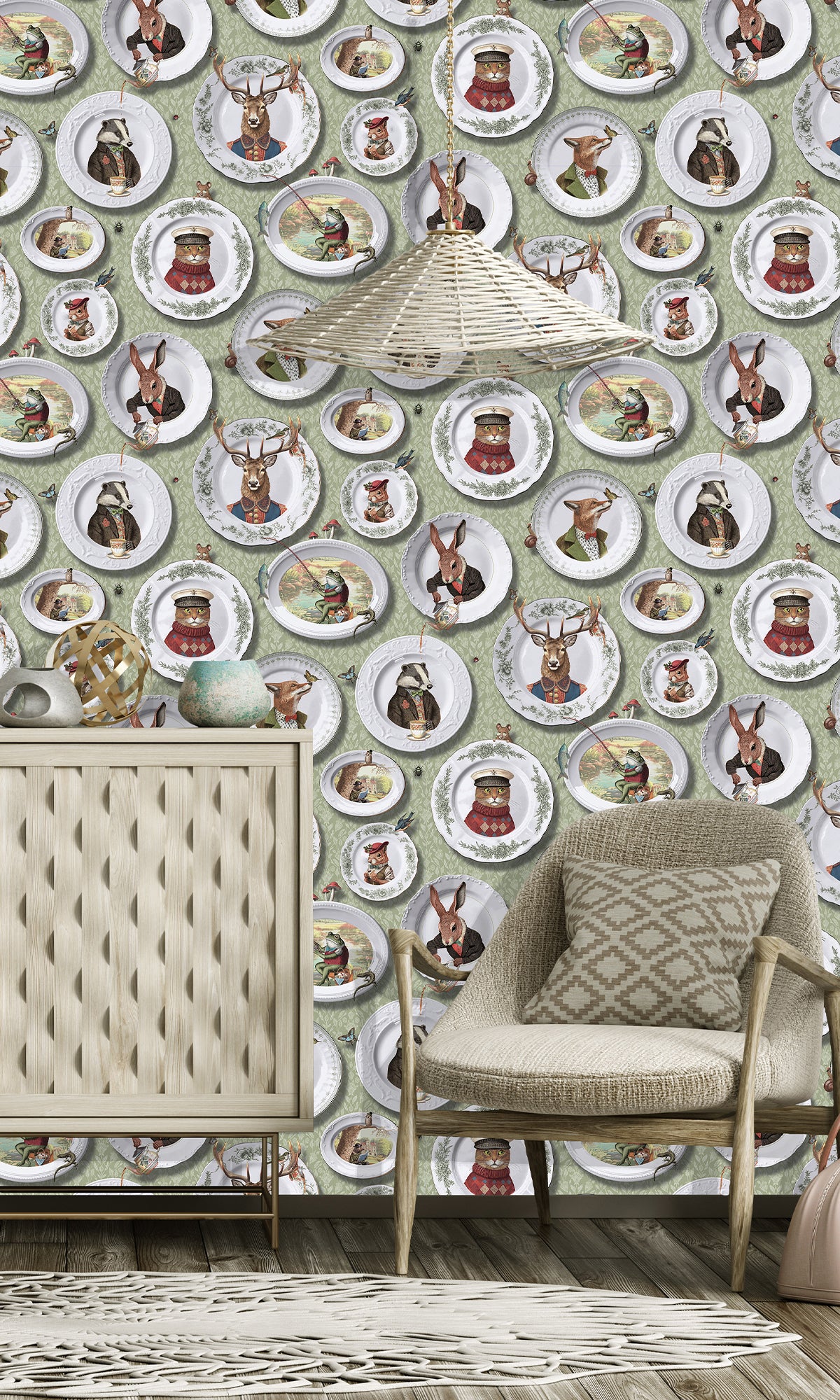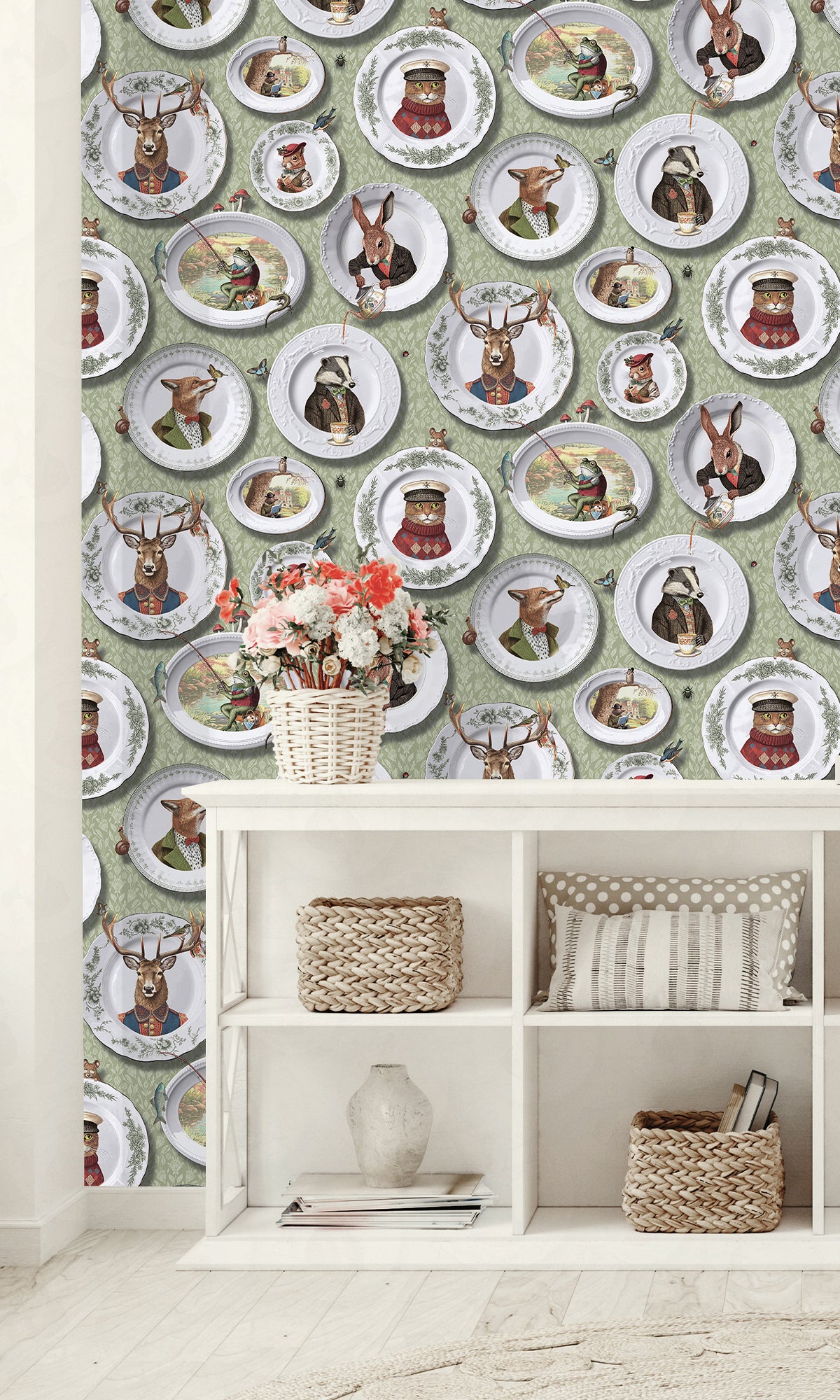 Step into a storybook world with this whimsical, vintage-inspired wallpaper, where quirky animals engage in delightful activities like tea drinking, fishing, and reading. Set against a classic damask-patterned backdrop, this design combines timeless elegance with lighthearted charm. Intricate details and unexpected elements create a conversational, storytelling feel, making it a captivating choice for any space.