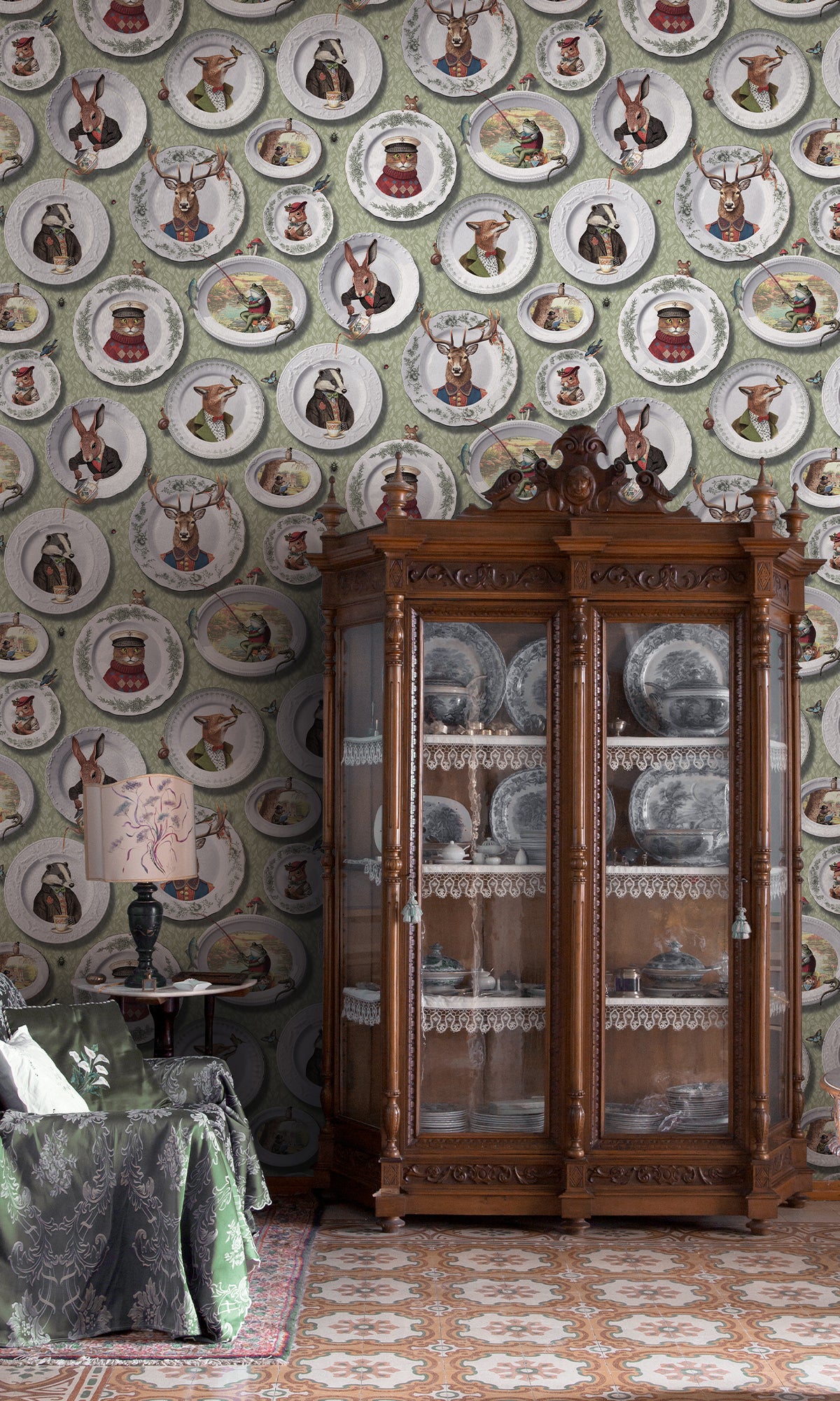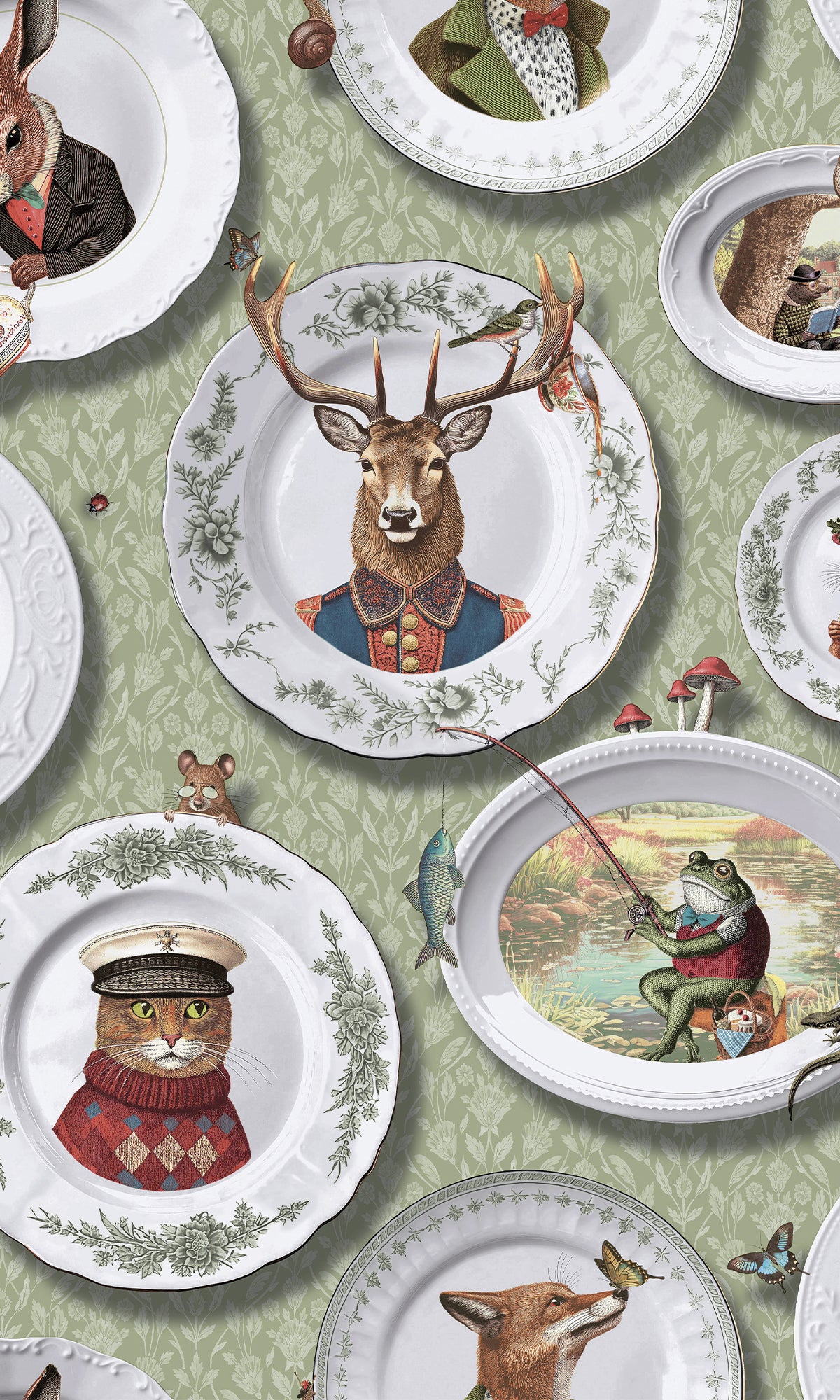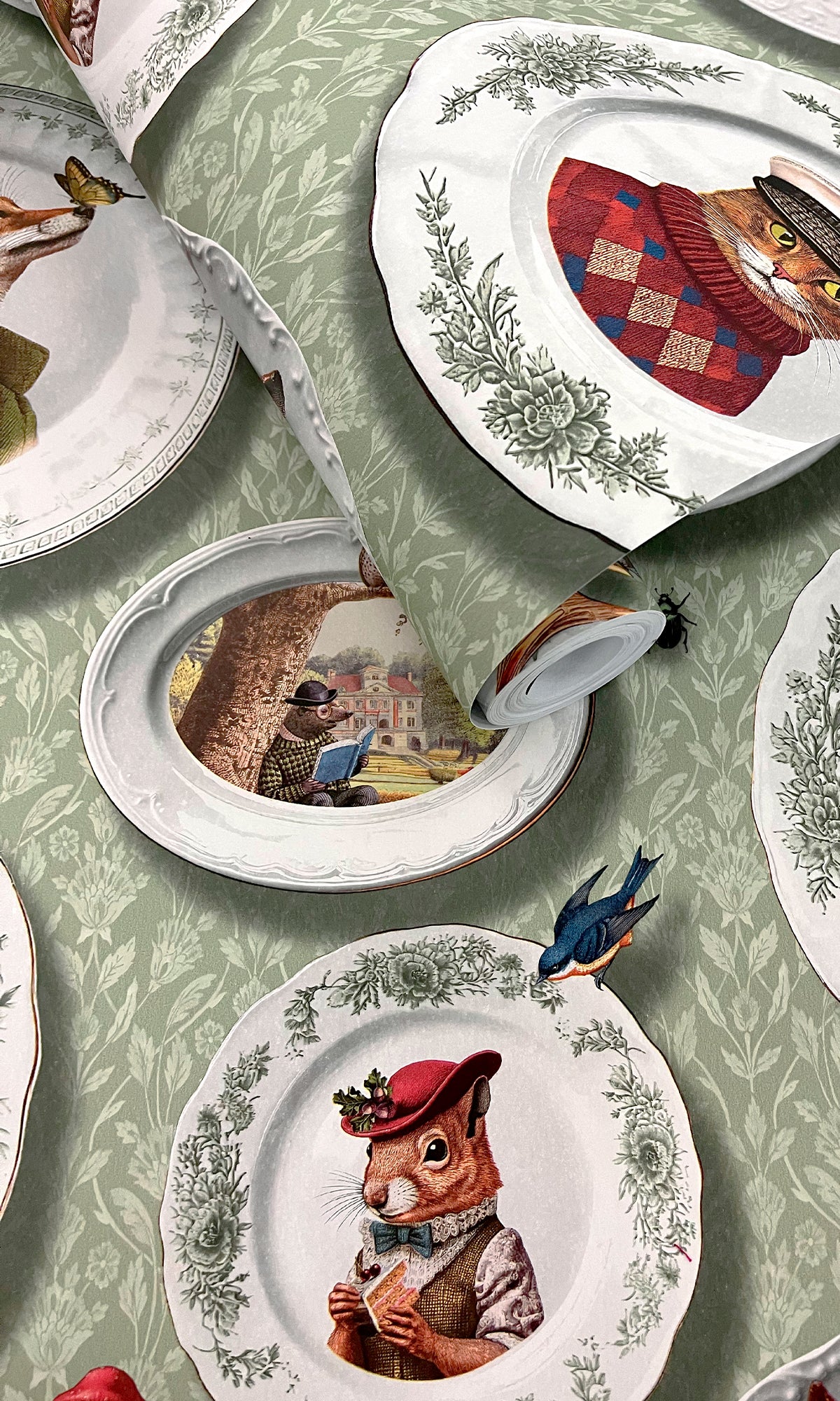 Step into a storybook world with this whimsical, vintage-inspired wallpaper, where quirky animals engage in delightful activities like tea drinking, fishing, and reading. Set against a classic damask-patterned backdrop, this design combines timeless elegance with lighthearted charm. Intricate details and unexpected elements create a conversational, storytelling feel, making it a captivating choice for any space.
