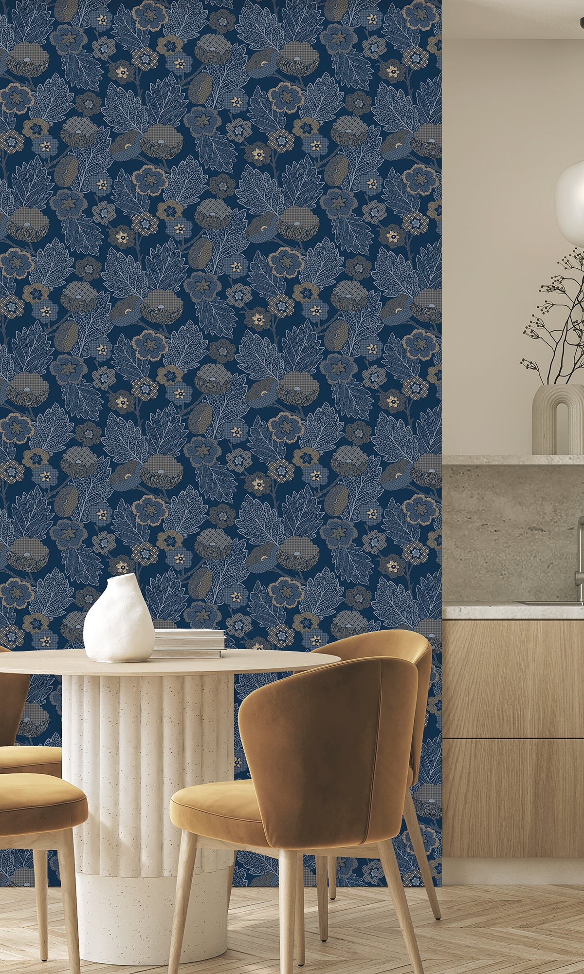 Meet our Poppies and Leaves wallpaper, a vibrant, nature-inspired choice for contemporary spaces. This design features a delightful array of poppies in different shapes and sizes, beautifully layered over hawthorn and birch leaves. The result is a gentle, botanical rhythm that infuses warmth and charm into living rooms, bedrooms, hallways, and boutique areas. With its subtly textured surface, this wallpaper adds depth and a handcrafted touch, making your walls feel rich and inviting.