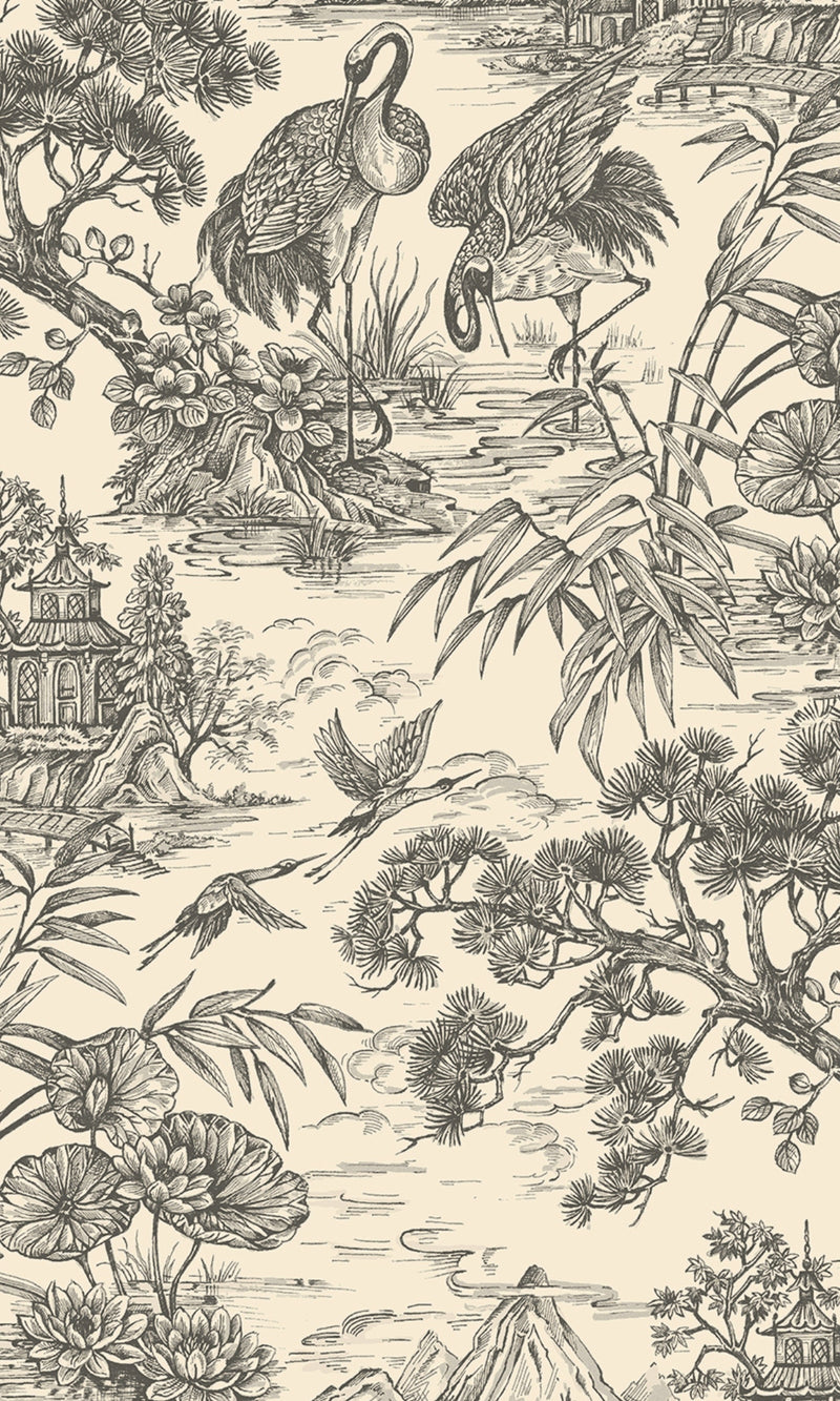 Charcoal Cream Majestic Crane Tropical Wallpaper R8971