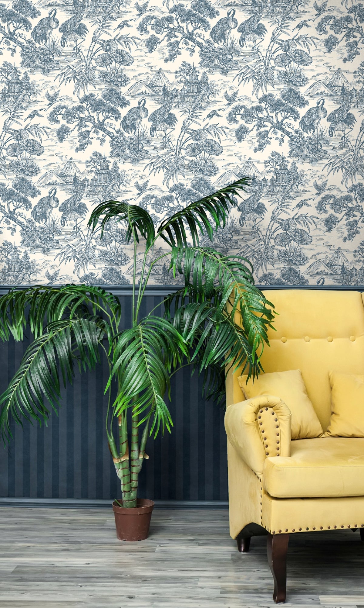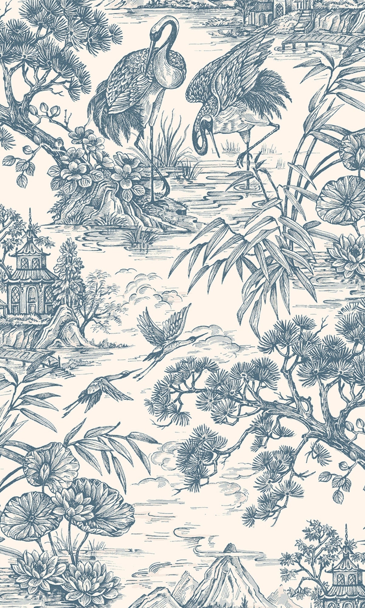 Navy Cream Majestic Crane Tropical Wallpaper R8973