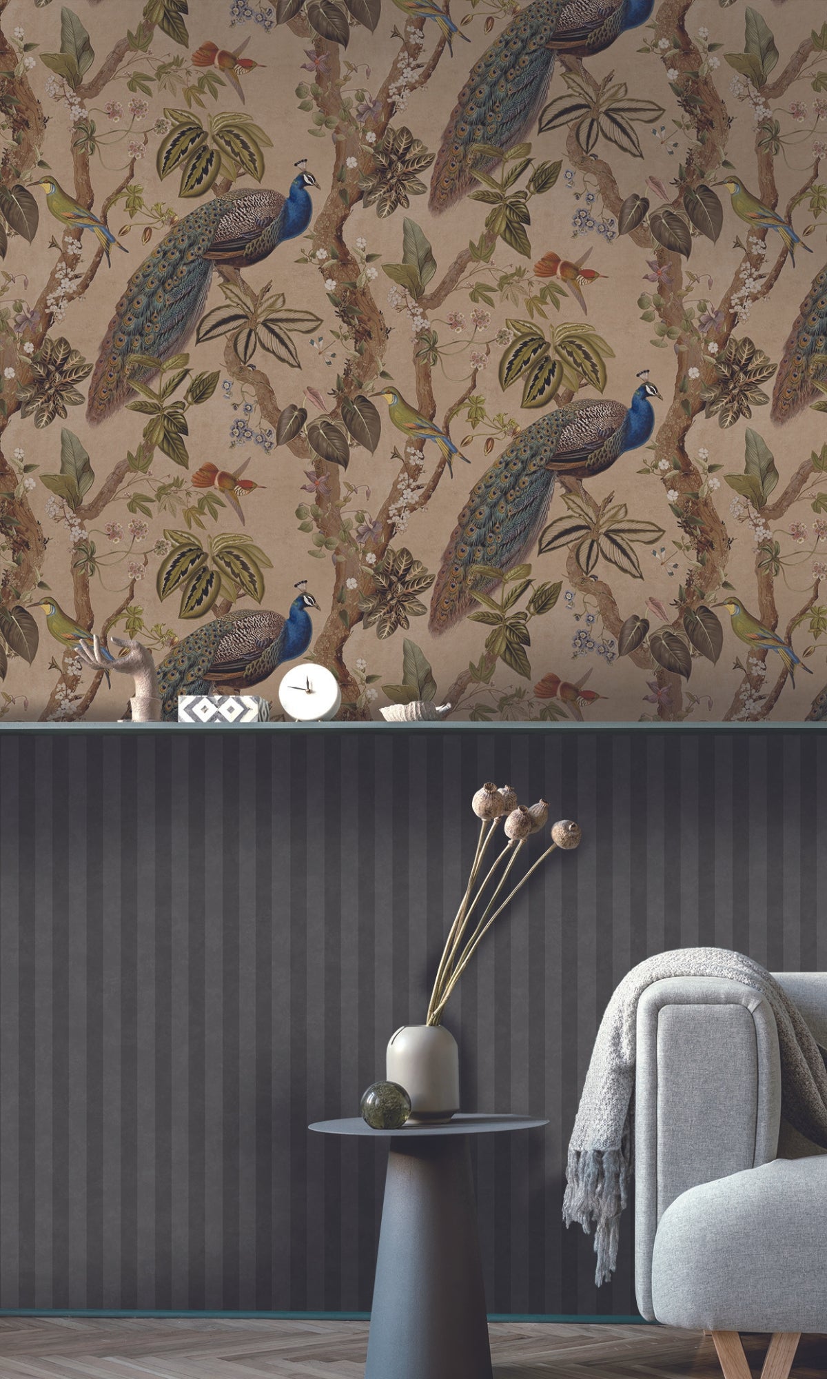 Taupe Climbing Peacock & Climbing Florals Tropical Wallpaper R8987