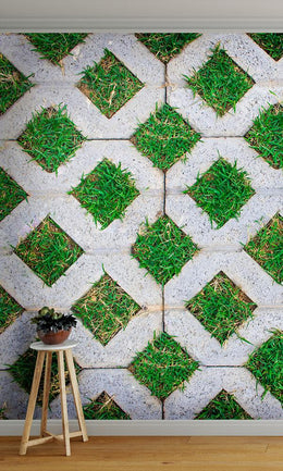 A diamond trellis pattern formed by concrete masonry creates a clean geometric pattern. Tufts of grass grow out from the center of the diamonds to give the perfect mix between urban and nature.