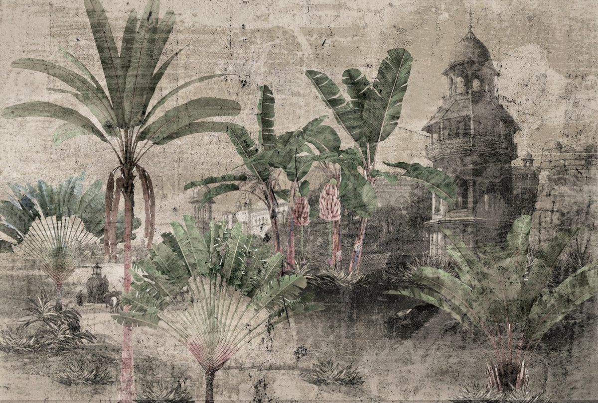 This vintage digital print features a faded illustrated landscape in the background with large tropical trees and plants in the foreground. A weathered effect is applied throughout the mural for a worn and aged effect.