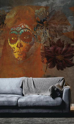 This highly visual and saturated mural features Mexican themes to create a Dia de los Muertos (Day of the Dead) design. A woman with traditional Day of the Dead face paint is complimented with abstract shapes and flowers.
