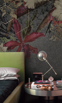 Red Printed Floral on Cracked Concrete Mural Wallpaper M9535