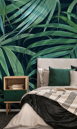 This tropical wallpaper features large scale botanical leaves that overlay to form a dramatic jungle scene. The illustrated style and dramatic depth make this the perfect hotel wallpaper.