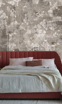 This faux wallpaper mural features a realistic concrete wall that has been damaged and stained. A subtle geometric pattern is overlaid on the concrete, creating a grid-like appearance. The urban style makes for a great hotel or lobby wallpaper.