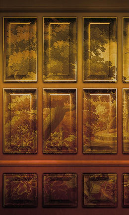 This tromp l'oeil design features vintage, illustrated artwork painted on top of a faux wooden wainscot wall.