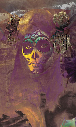 This highly visual and saturated mural features Mexican themes to create a Dia de los Muertos (Day of the Dead) design. A woman with traditional Day of the Dead face paint is complimented with abstract shapes and flowers.