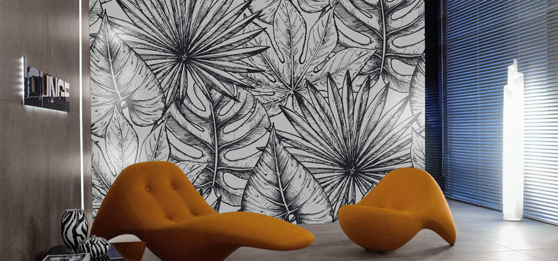 Black And White Sketch of Leaves Mural Wallpaper M1164