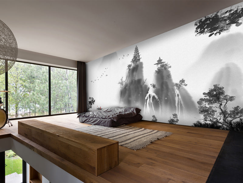 Black & White Japanese temple on top of a Mountain Mural Wallpaper M1158