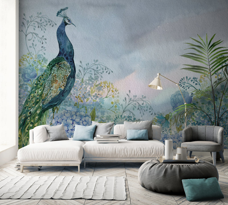 Blue Peacock in the Flower Garden Mural Wallpaper M1155