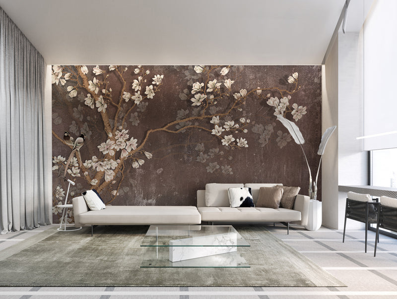 Brown White Blooms Mural Wallpaper M1152