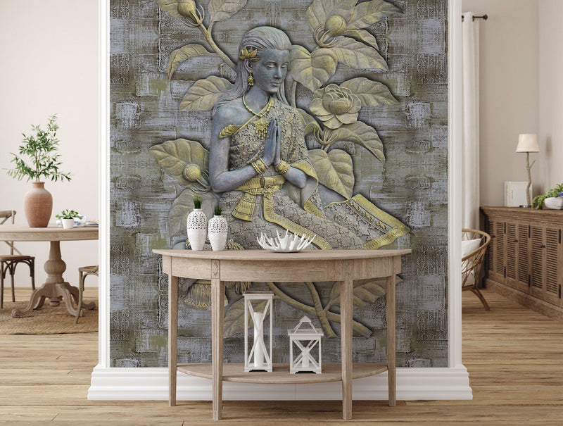 Gray & Gold Praying Girl Mural Wallpaper M1159