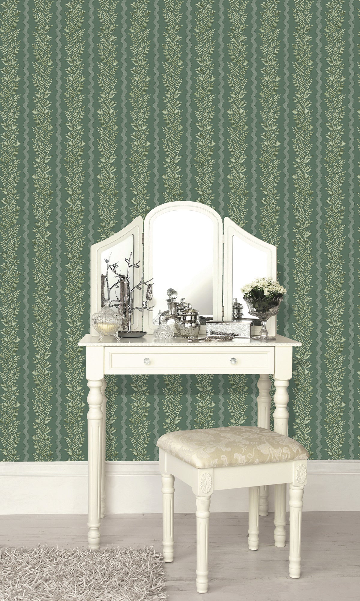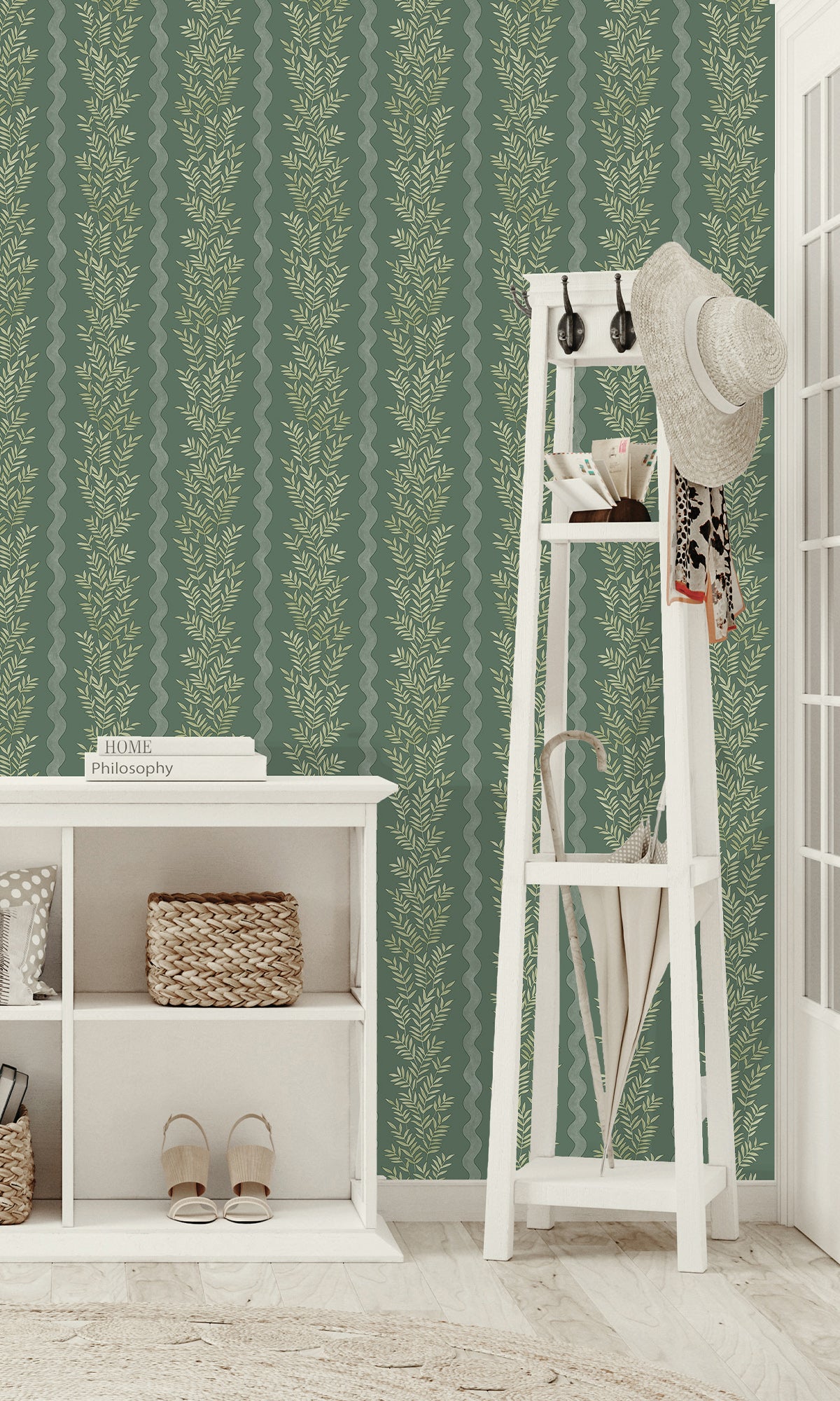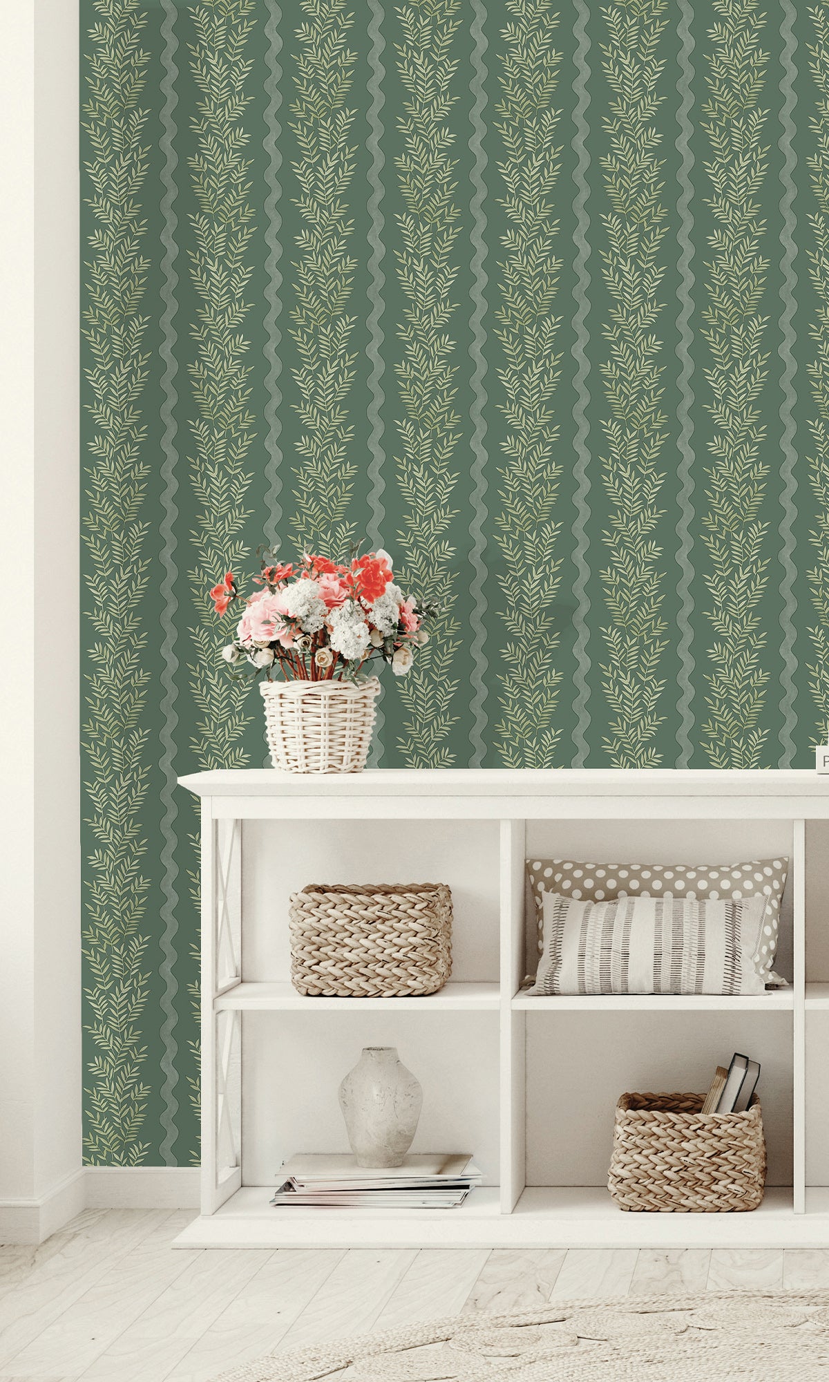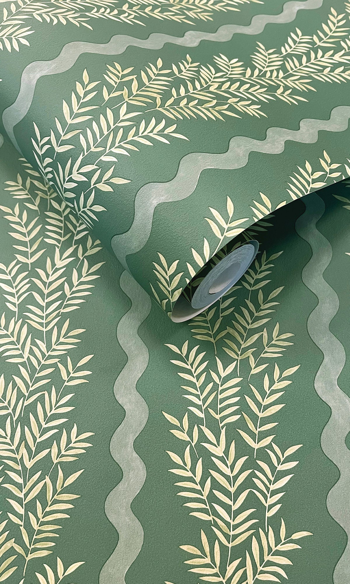 Floral Stripe Wallpaper reimagines the classic stripe with a modern, nature-inspired twist. Delicate tonal leaves create a sense of depth and movement, flowing effortlessly across the design. Framed by soft vertical waves, this pattern strikes a perfect balance between organic fluidity and structured sophistication, adding a refined touch to any interior.