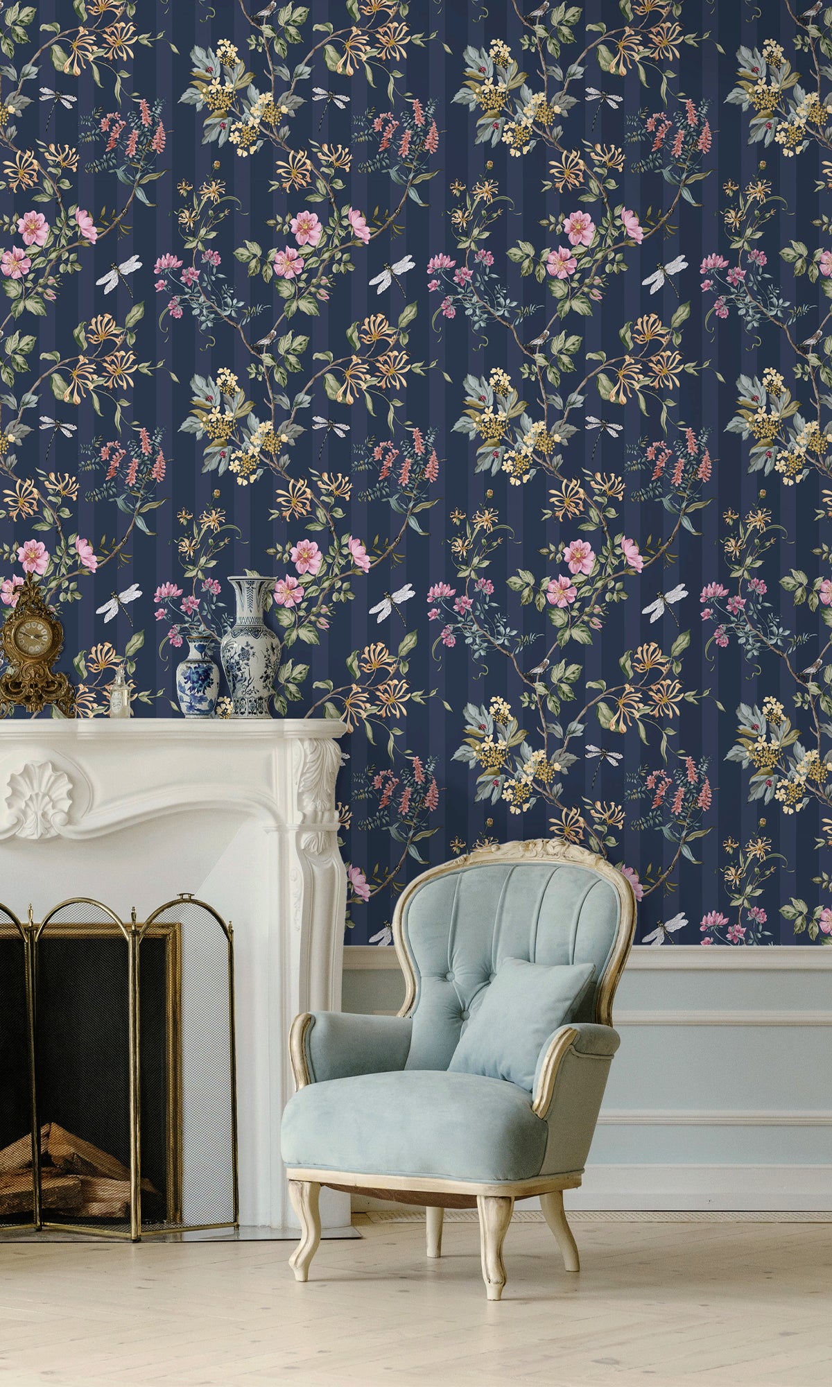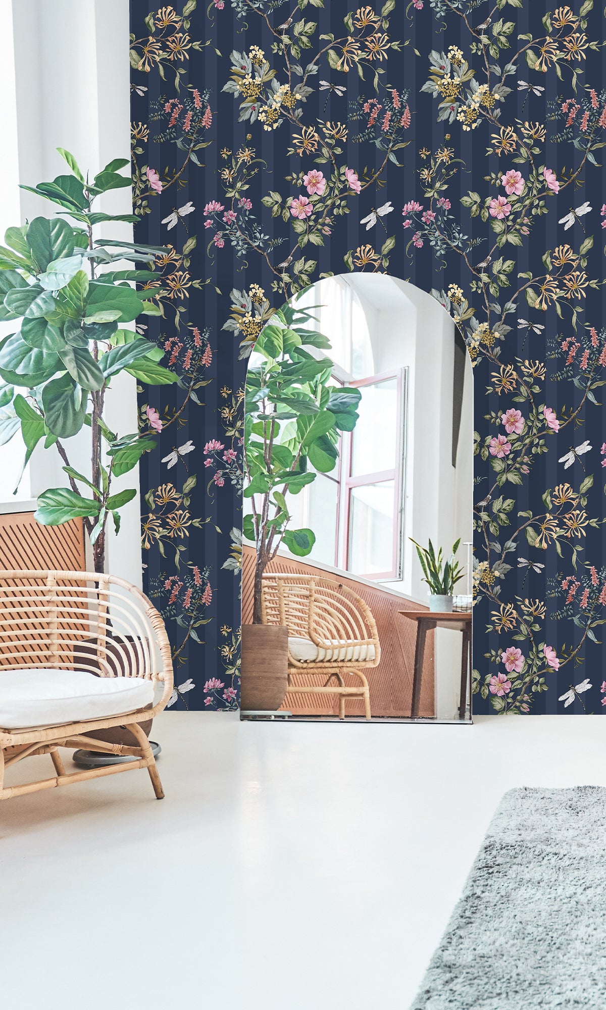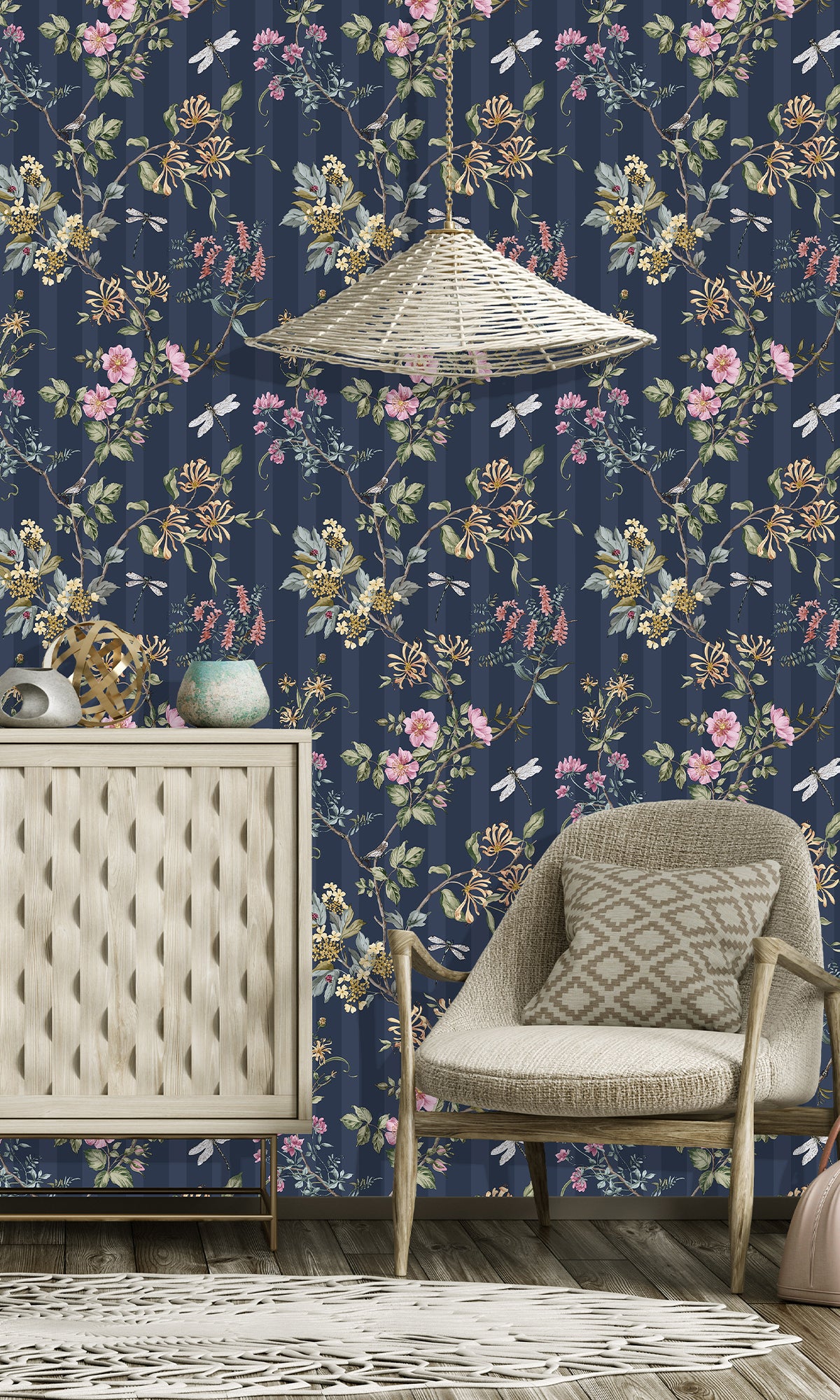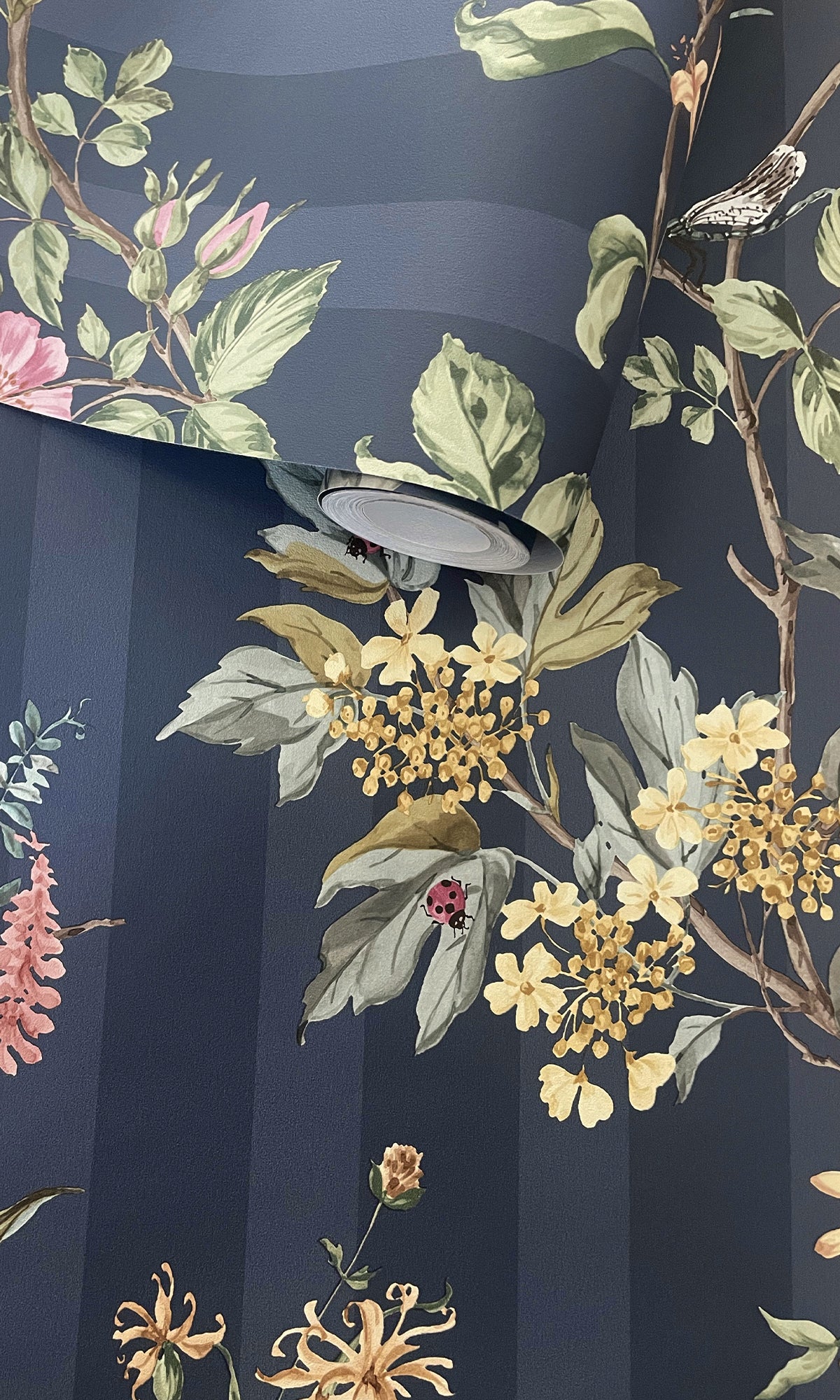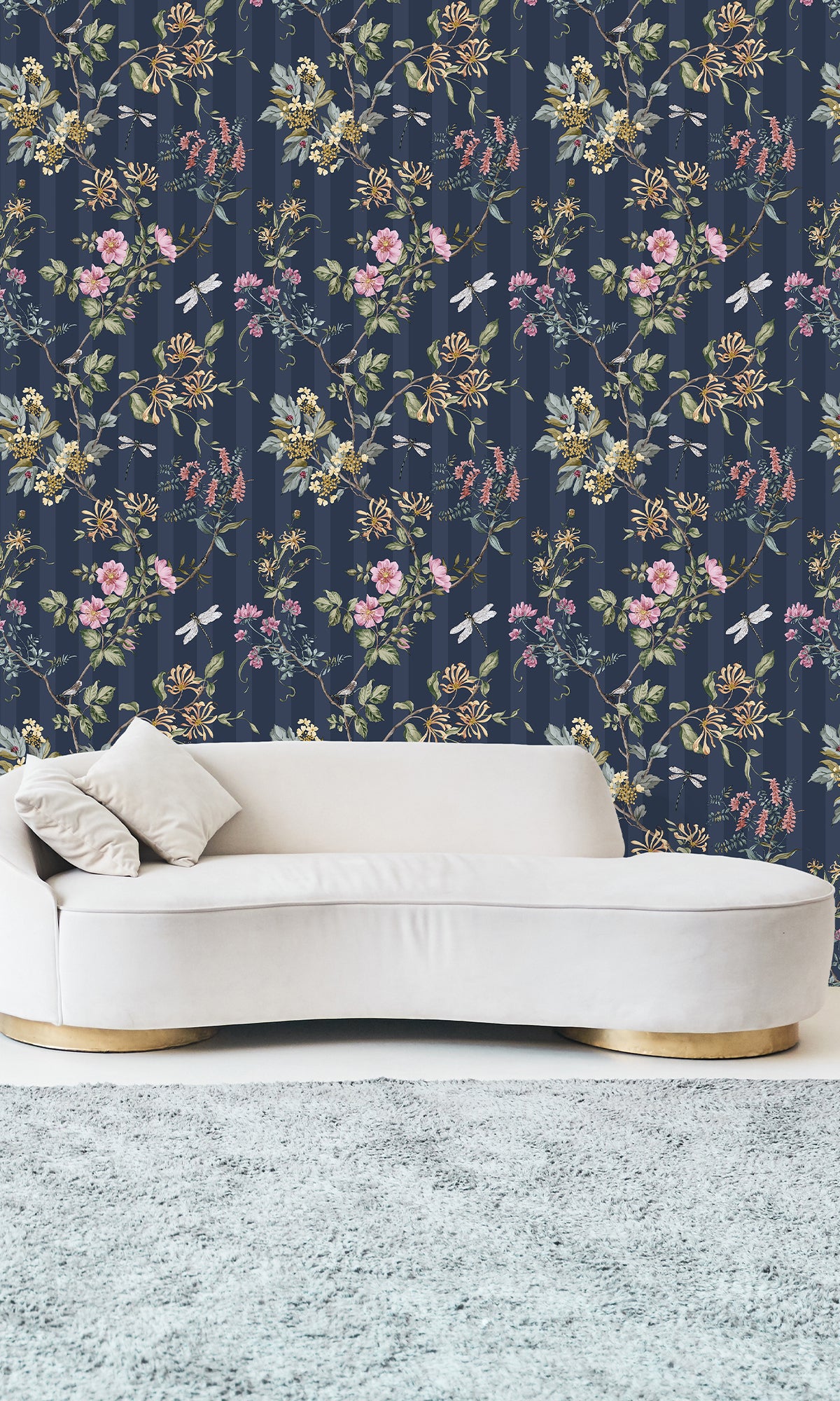 Give your walls a touch of natural elegance to your space with the Spring Meadow Floral Trail Wallpaper. This graceful design features delicate vines draping along flowing branches, adorned with budding blooms and spring flowers. Dragonflies hover gently among the blossoms, adding a whimsical charm to the pattern. Set against a subtle striped background, this wallpaper creates a sense of depth and movement while maintaining a soft, tranquil ambiance.