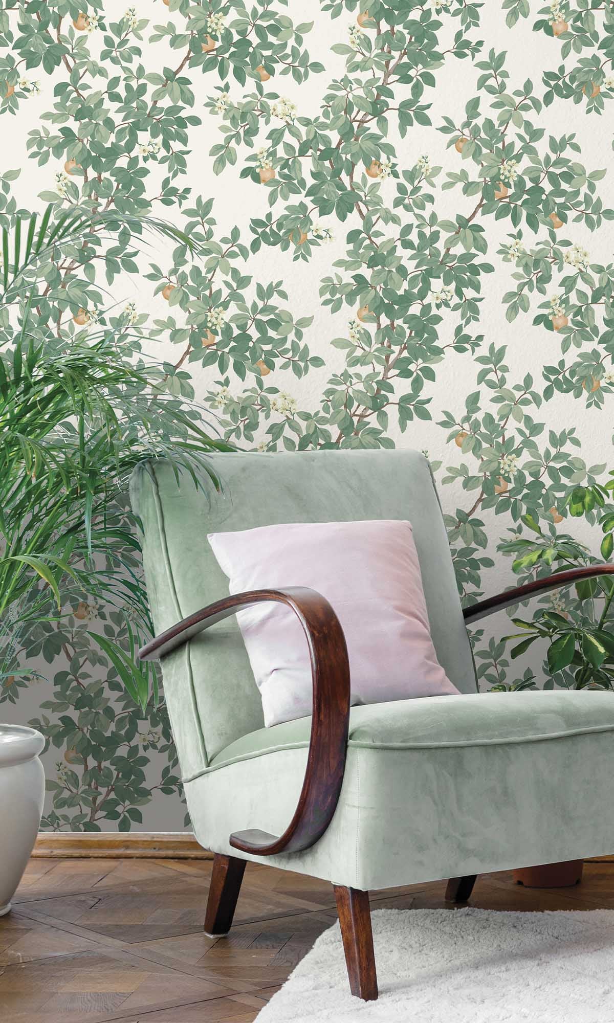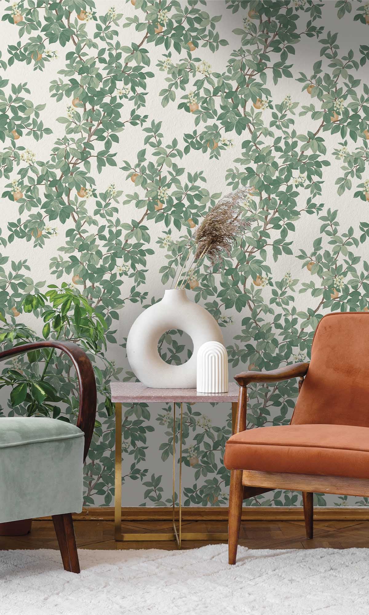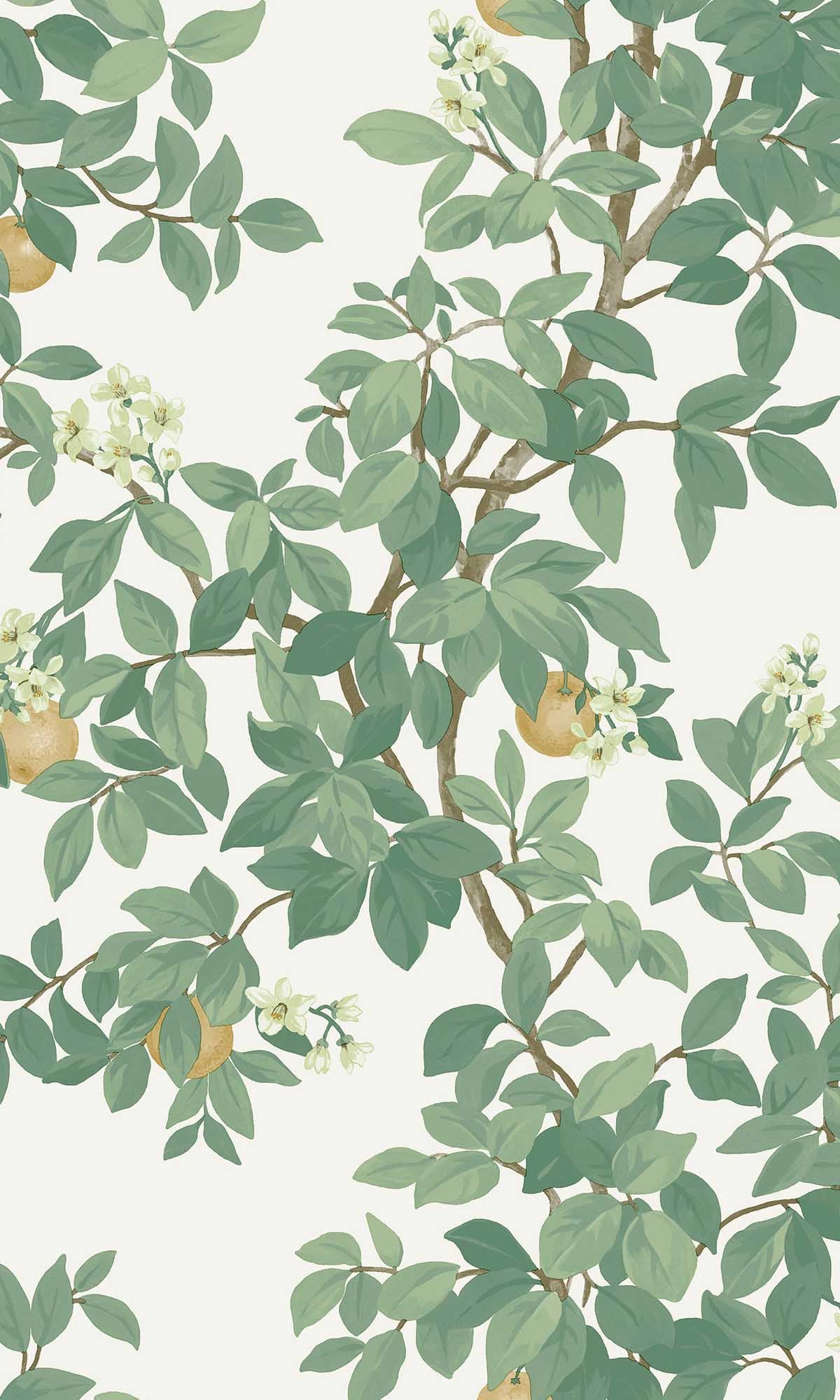 Cream Green Blooming Orange Tree Wallpaper R10086