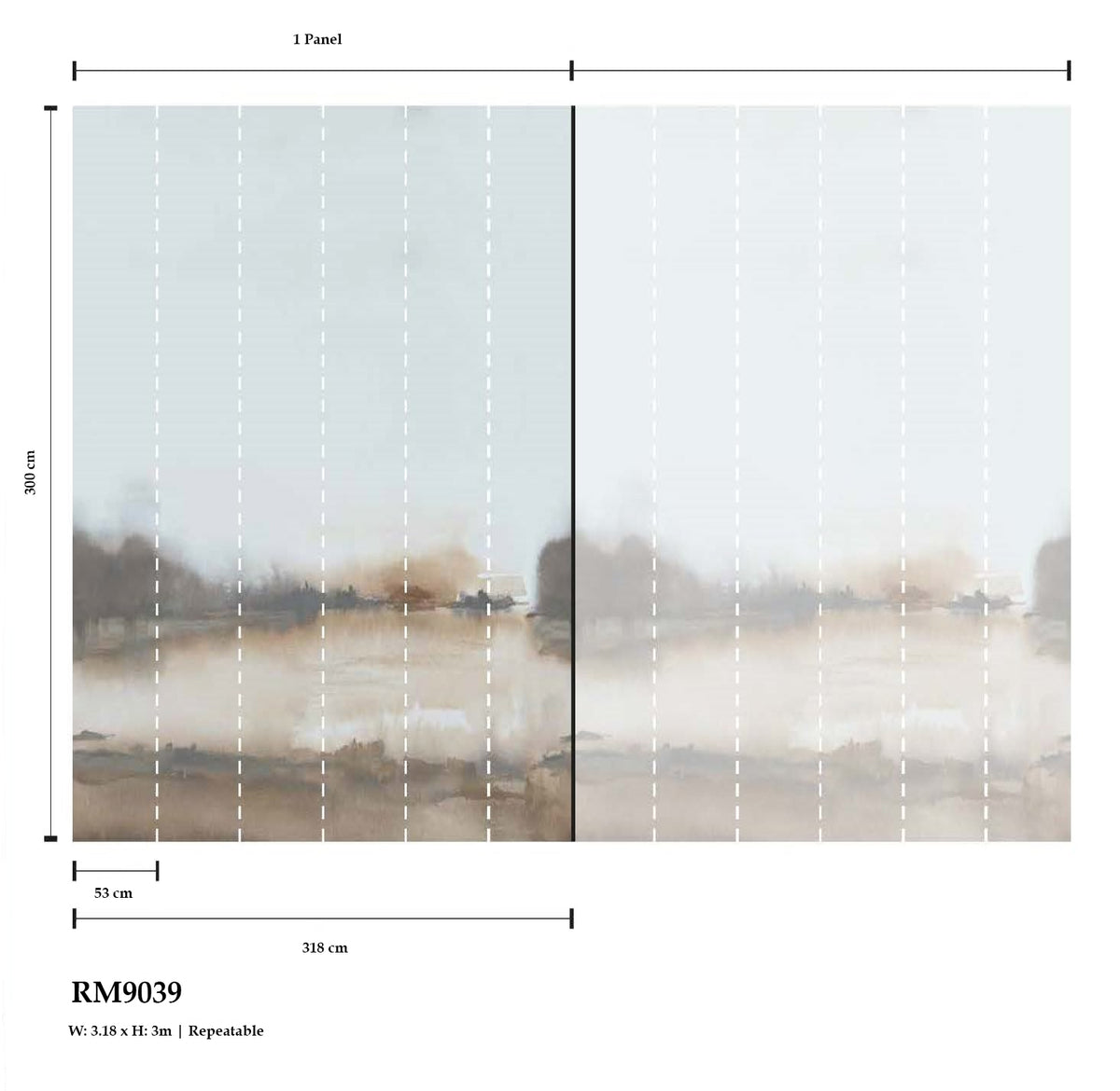 Mural standard size 300 cm H x 318 cm W - 6 panels (53 cm each panel). Repeatable in width.