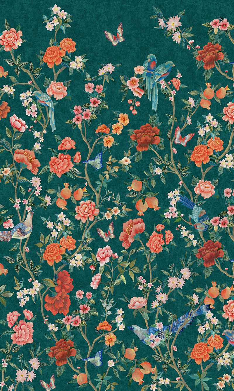 Teal Hand Painted Imperial Gardens Wallpaper RM9042