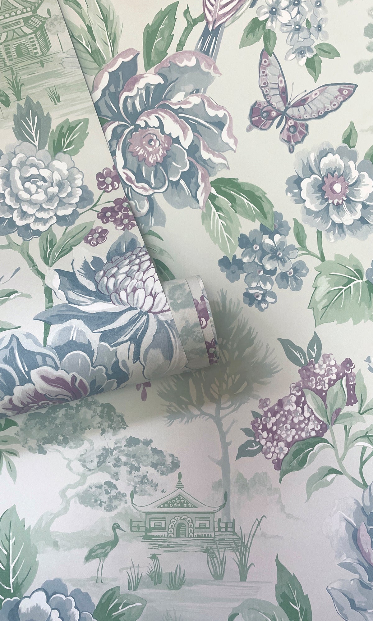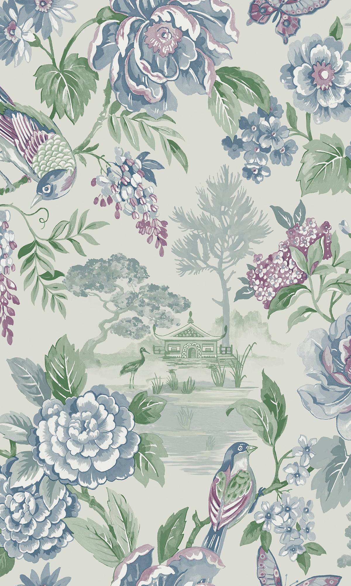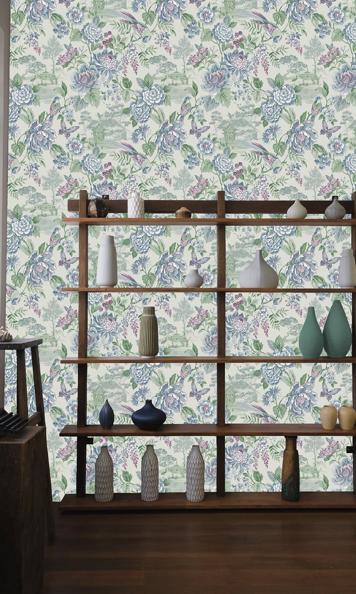 Immerse yourself in our Tranquil Blossoming Flowers in Nature Wallpaper! A design that captures the essence of nature's beauty, showcasing large blossoming flowers and playful birds, it evokes a serene and timeless scene. Taking inspiration from the Japanese classics, the tranquil imagery of pagodas adds a peaceful charm to your walls, and the bold, nature-infused design of this wallpaper brings life to your home.
