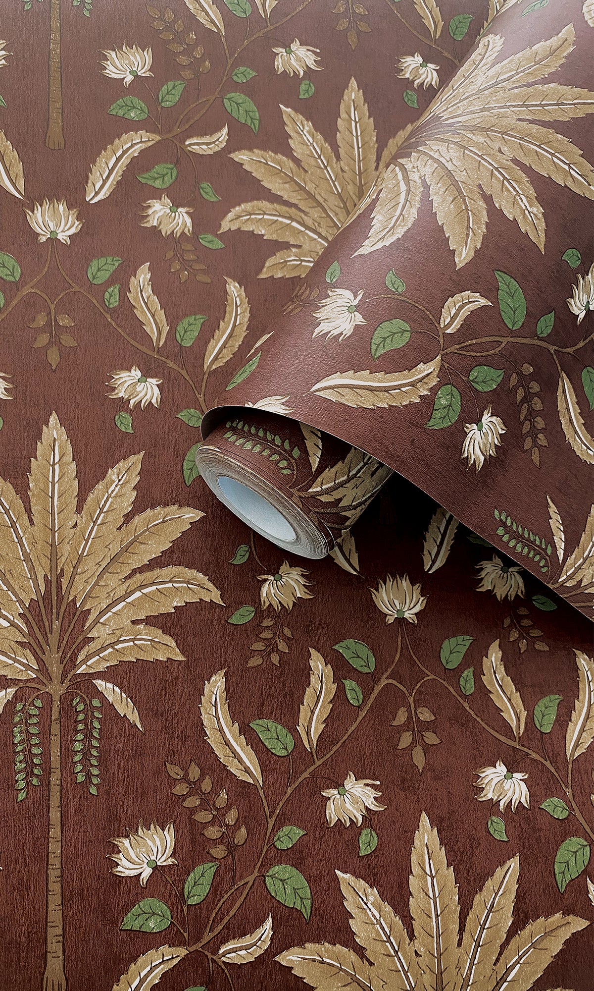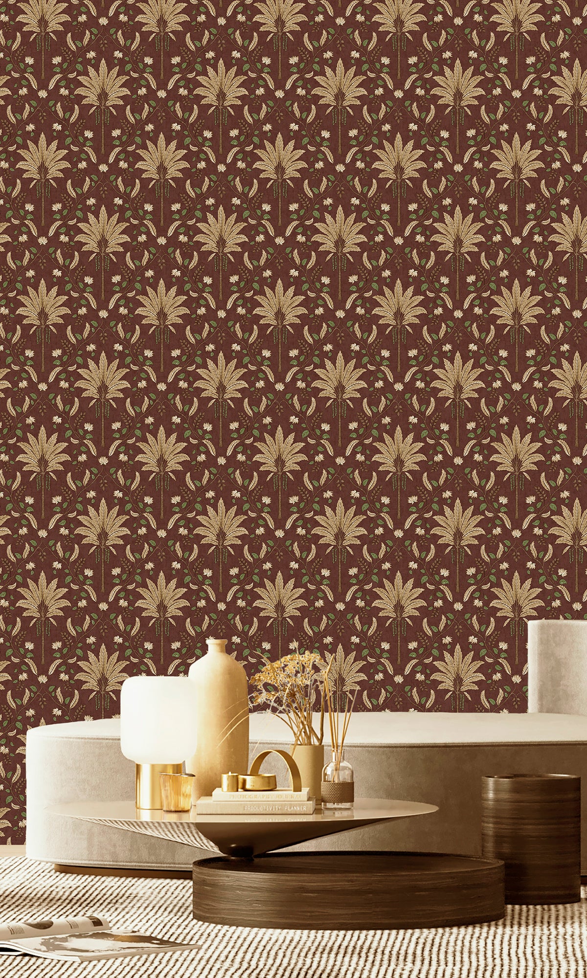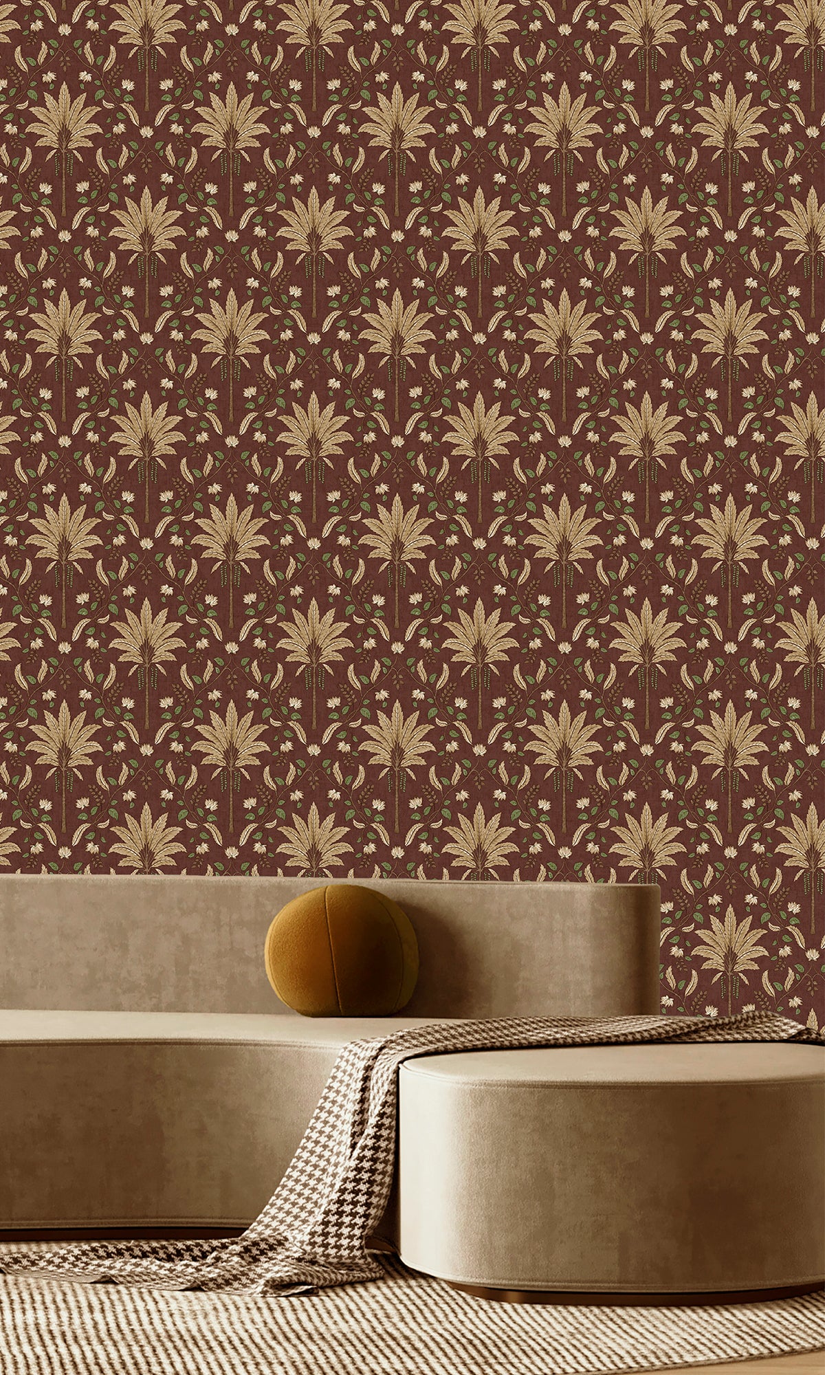 Maroon Trellis and Focal Palm Trees Wallpaper R9593