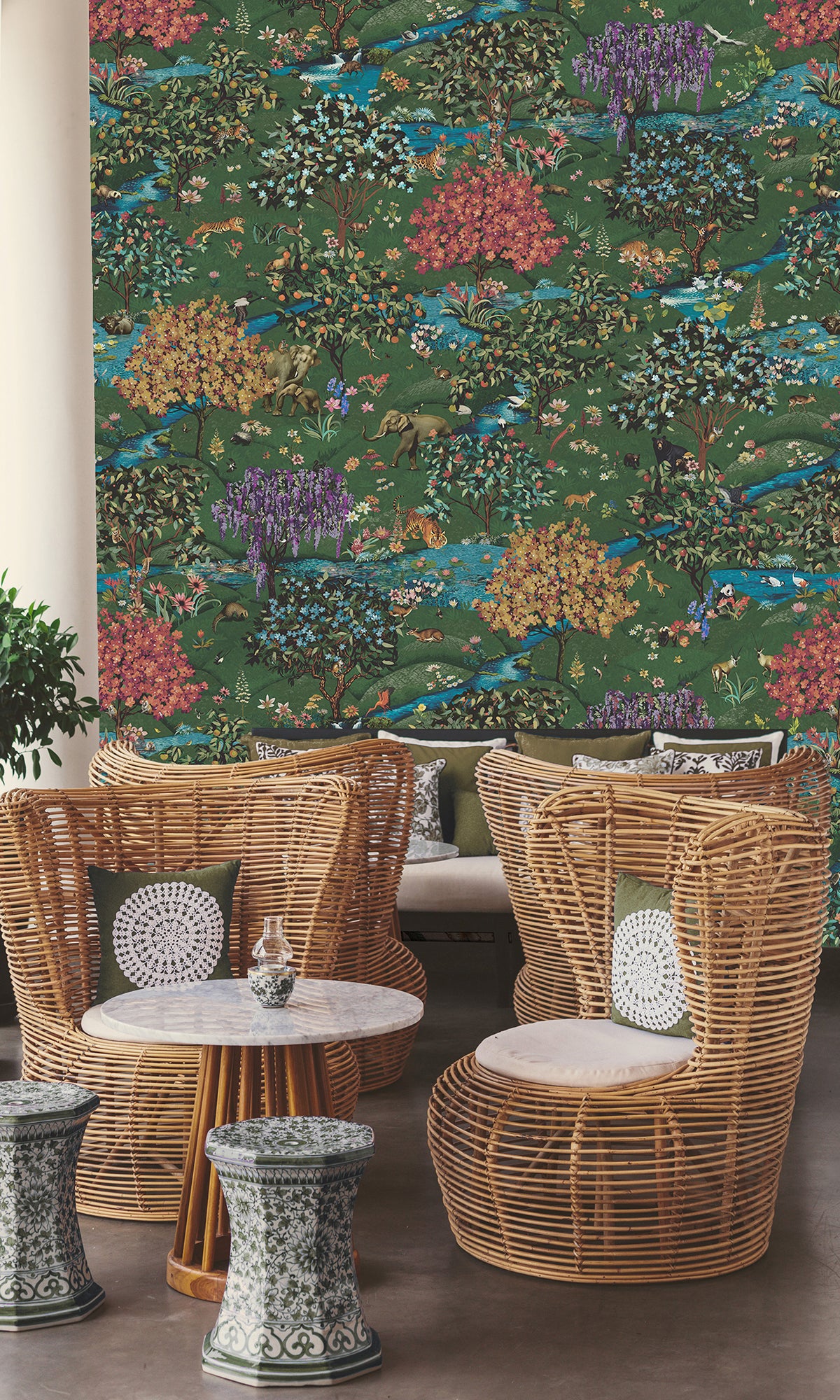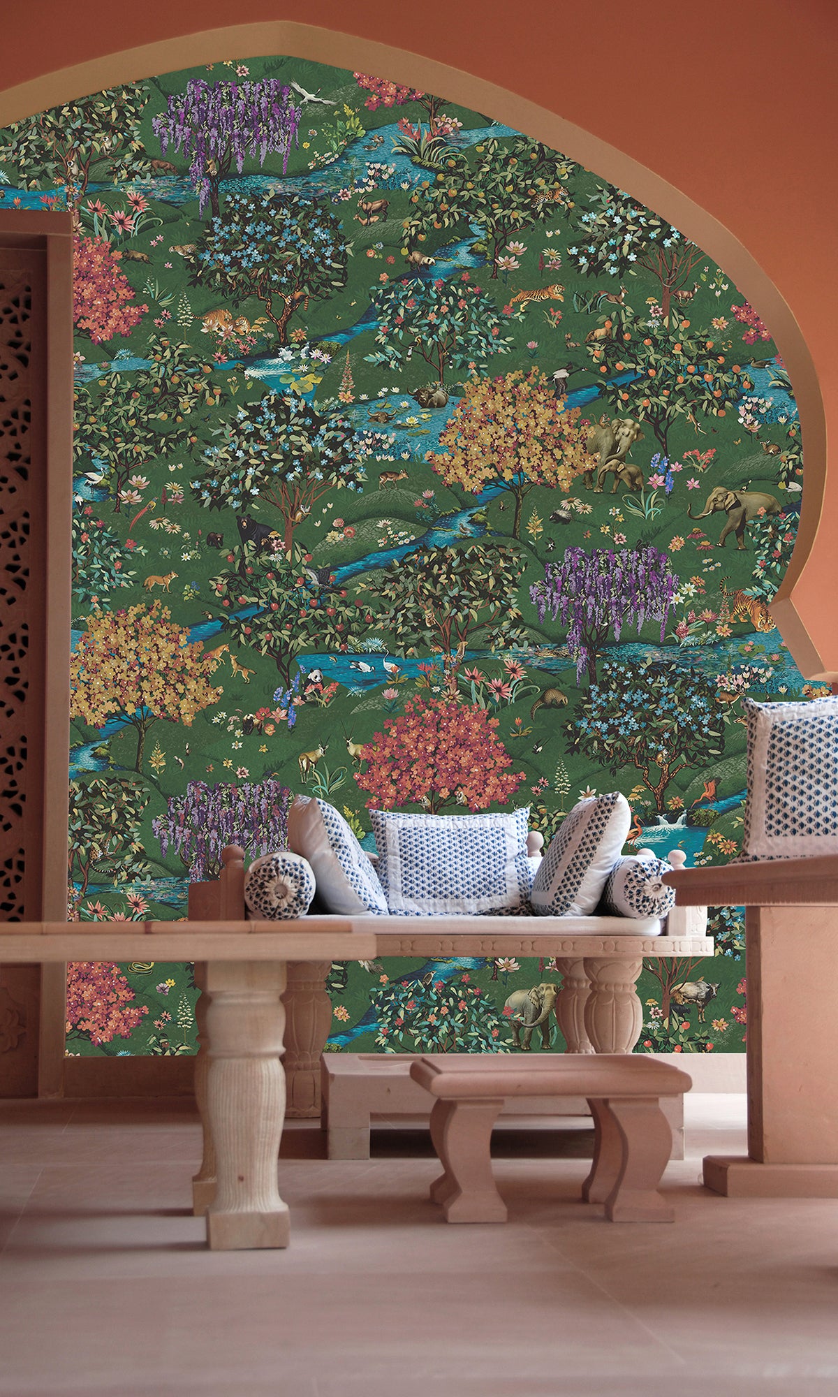 Bring nature's serenity into your home with our Enchanting Forest and Hills mural wallpaper. Let yourself be bewitched with the enchanting beauty of Eastern Asia's forests, rolling hills, sparkling lakes, and diverse wildlife, creating a unique, serene, and magical atmosphere. Discover tigers, elephants, and leopards as they roam through the landscape, hidden and clouded among the flowering trees.
