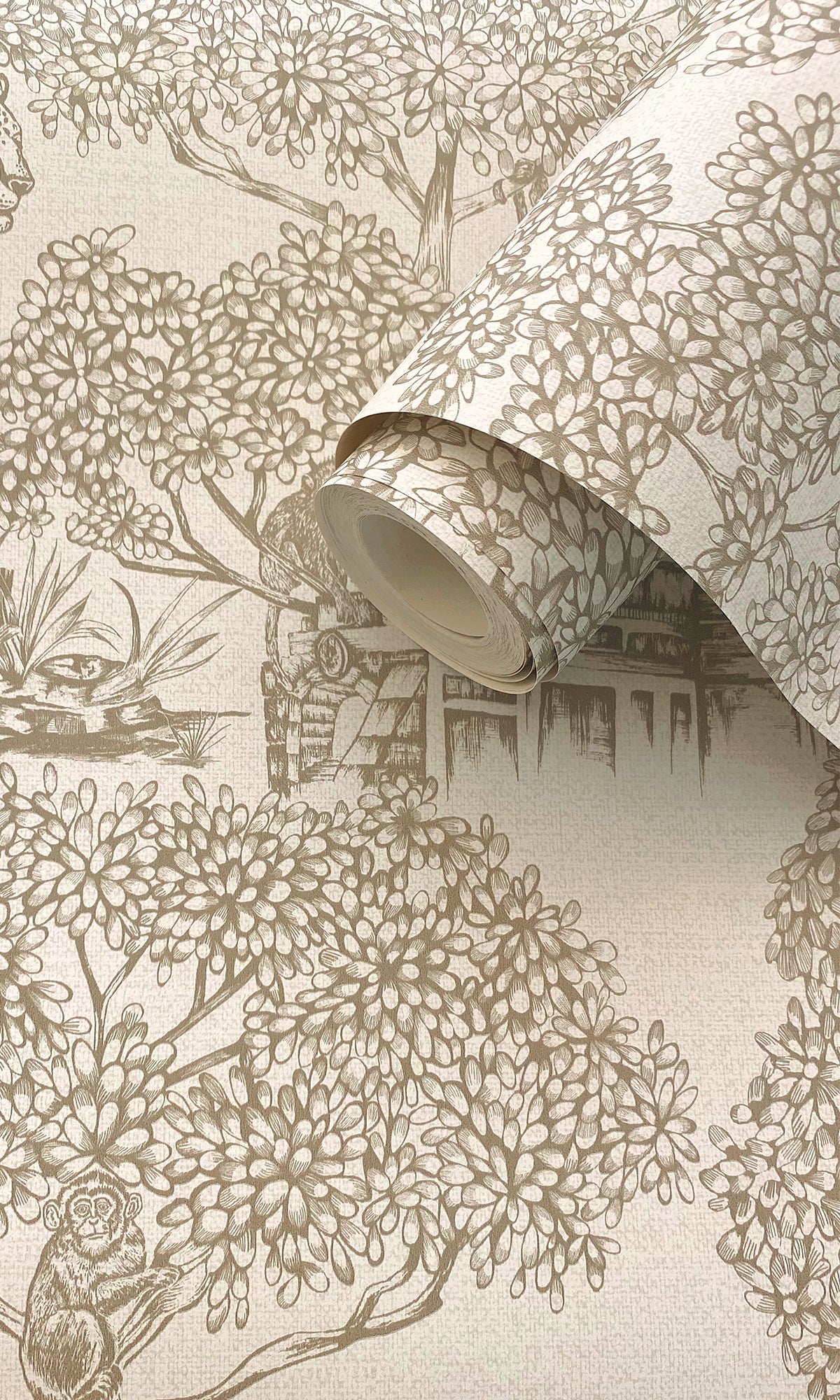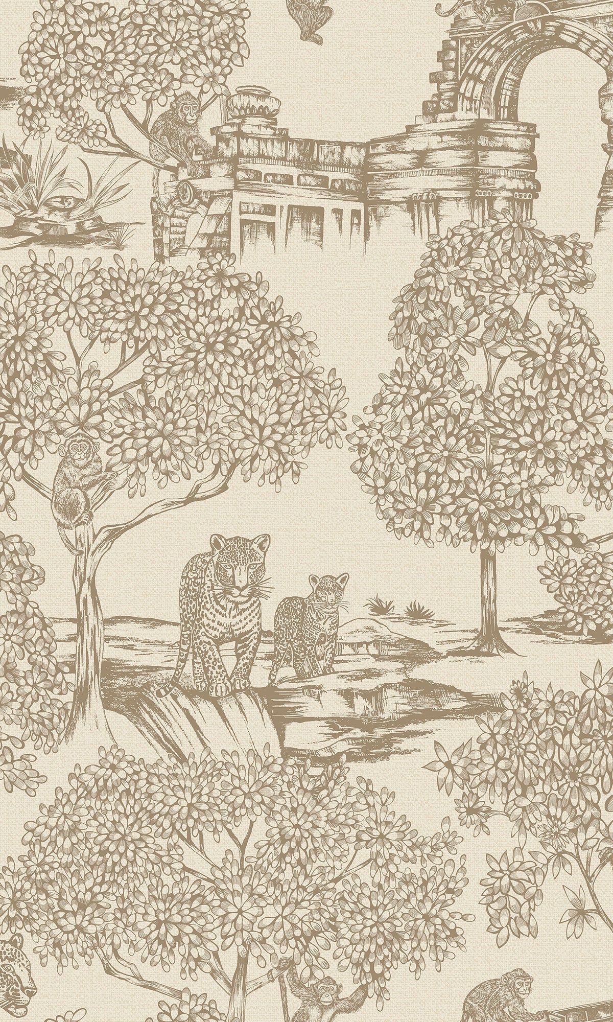 Elevate your home with the luxury of nature! Let the wild beauty of the Enchanting Wildlife Landscape wallpaper rejuvenate your walls. Featuring playful leopards and monkeys set against the weathered ruins of an ancient civilization, together with the metallic accents throughout the wallpaper, adds a luxurious shine and shimmer, making your walls come alive with vibrant energy and opulence.