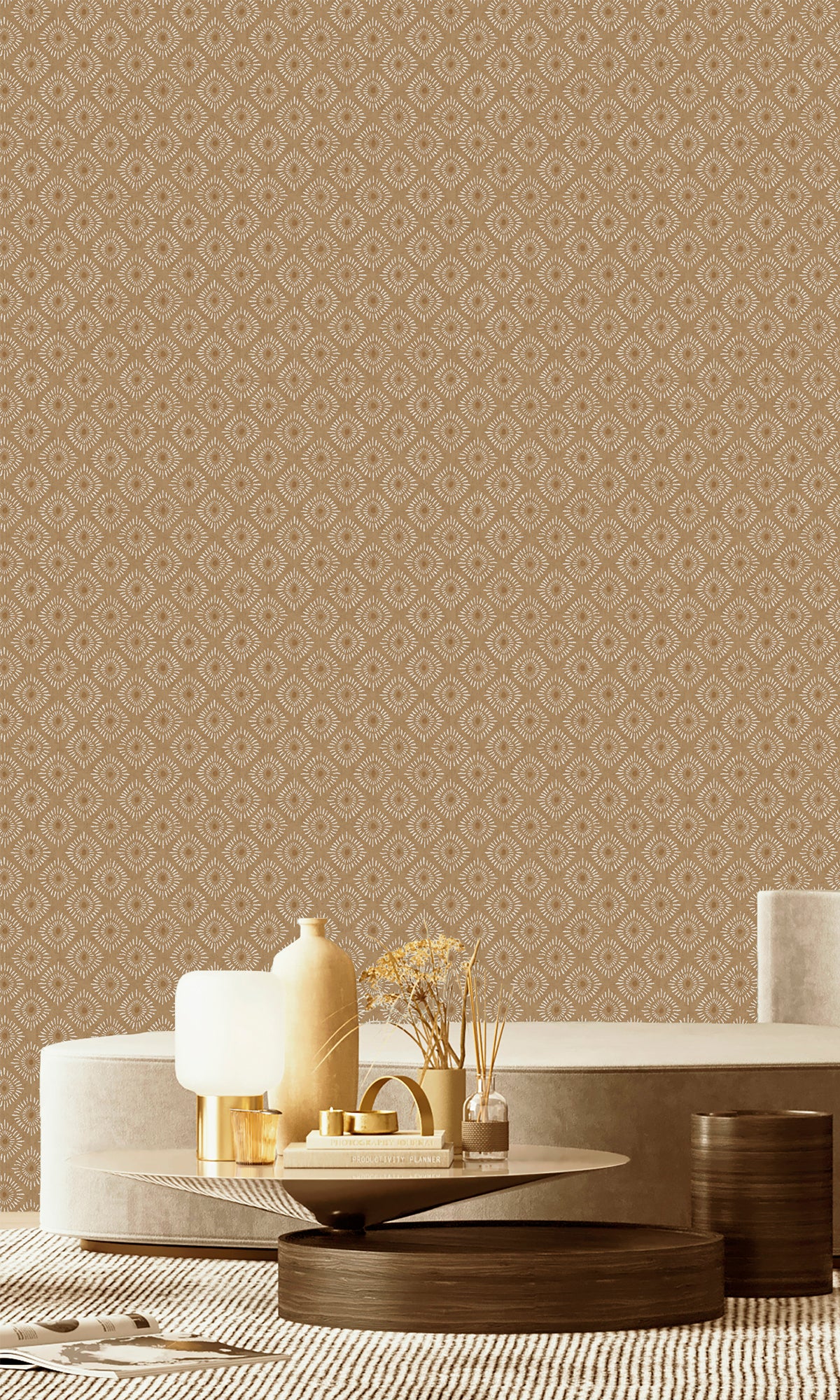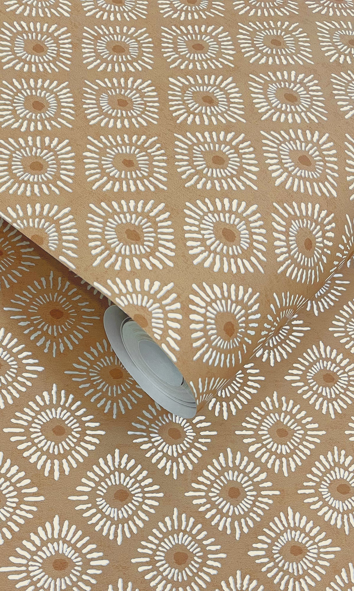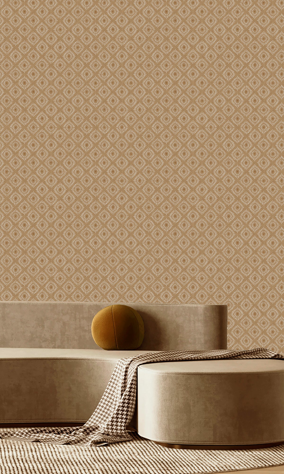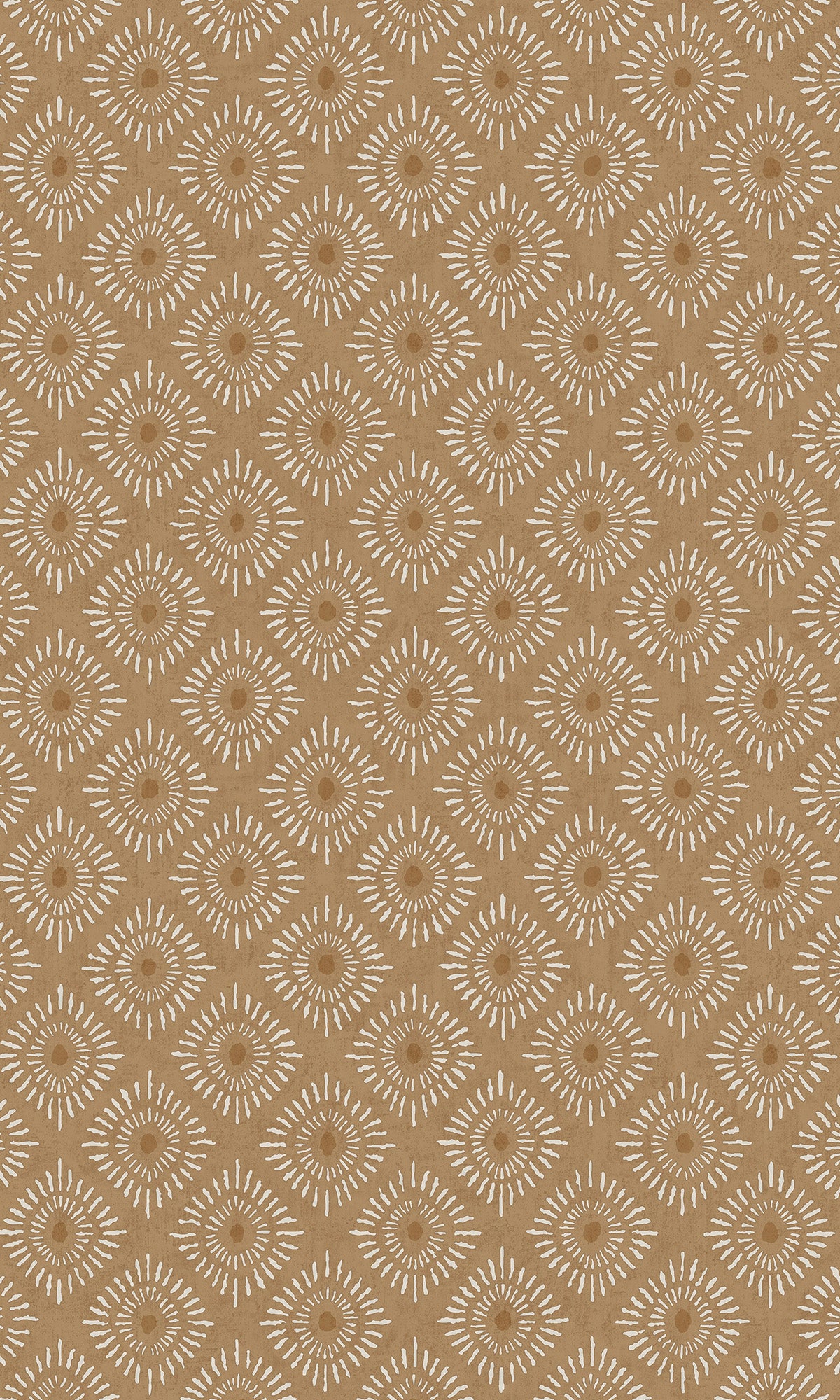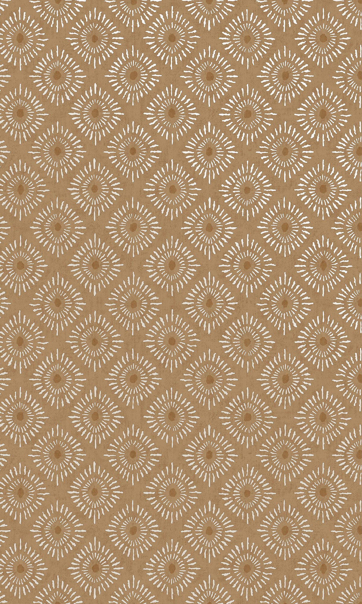 Infuse your space with warmth and light with the Radial Sun Motif wallpaper. This exquisite wallcover, taking inspiration from the intricate radiant beauty of Indian block printing, celebrates the abundance and warmth of the sun. The luminous radial sun motif design adds a vibrant yet serene atmosphere to any room and creates a space filled with light and positive energy.