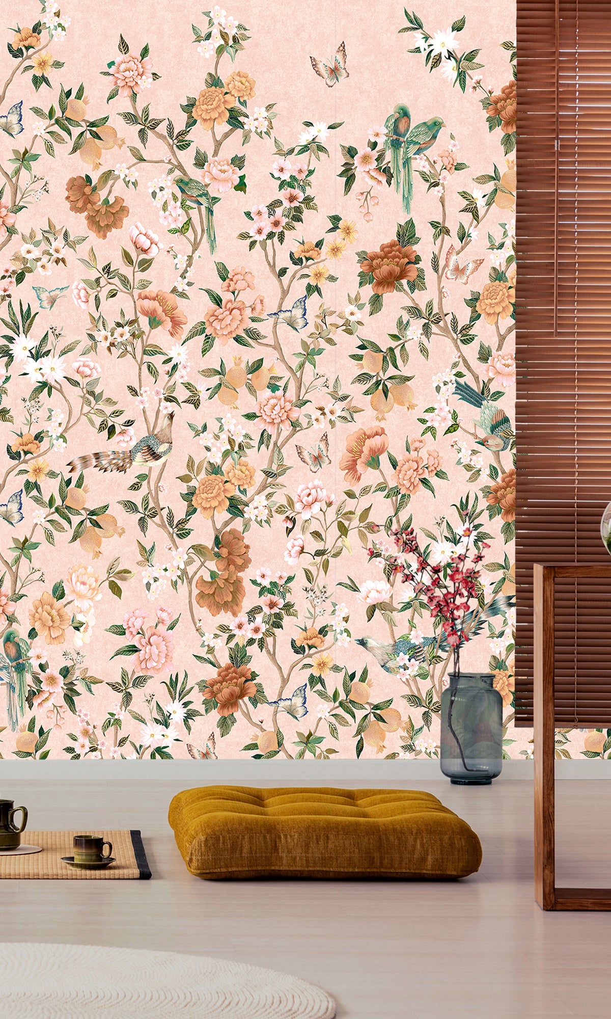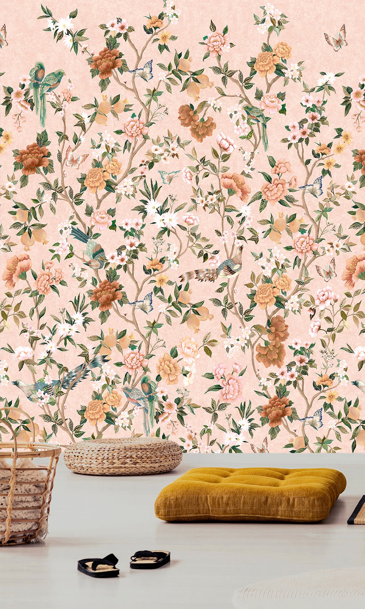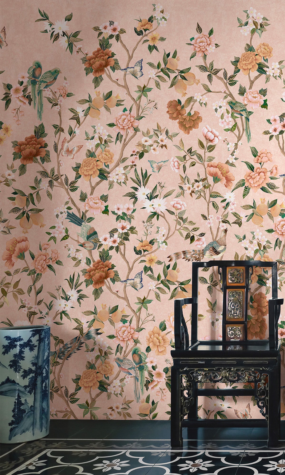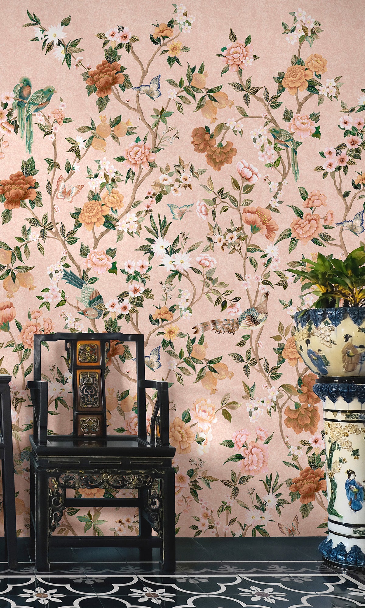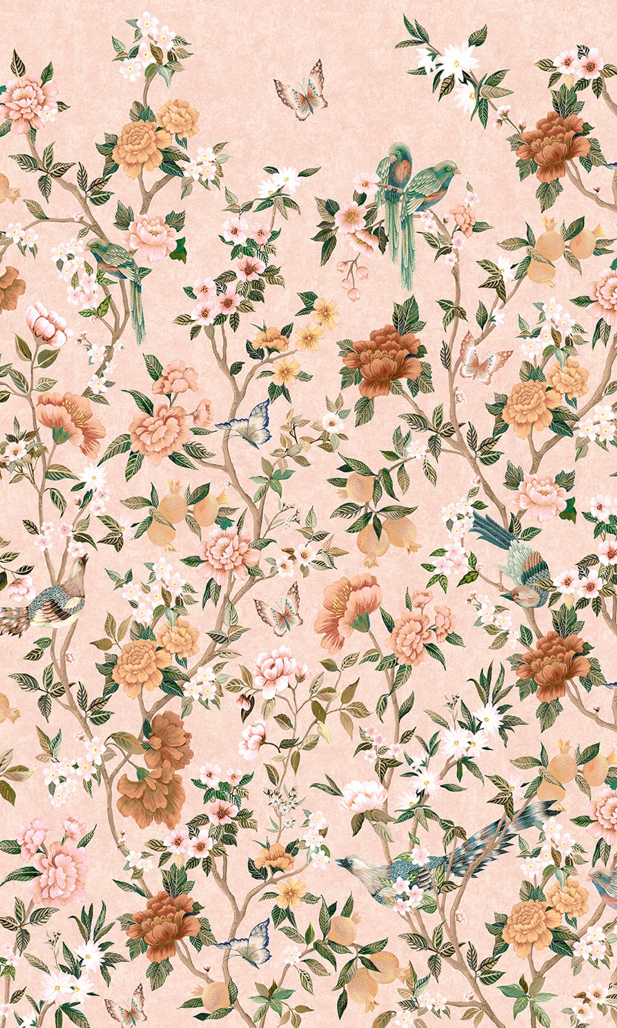 Discover timeless elegance from the Forbidden City through our Hand-painted Imperial Gardens mural wallpaper. This exquisite wallpaper features hand-painted trailing peonies that symbolize wealth and prosperity, closely interwoven with whimsical birds and butterflies. With inspiration coming straight from the heart of Beijing's Forbidden City, each detail of this mural tells a story of ancient beauty and enduring nature—a perfect statement piece for any room.