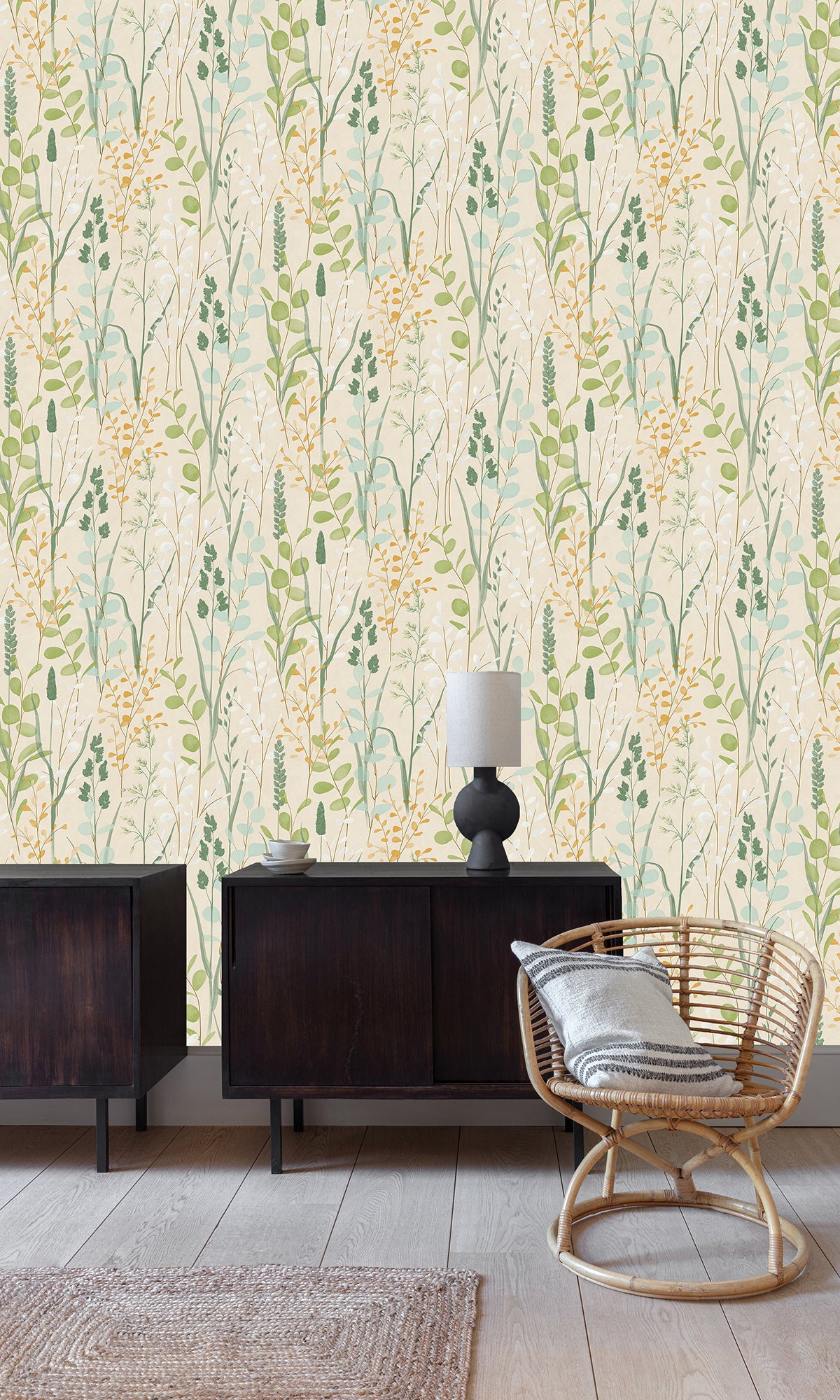 Embrace the carefree charm of the countryside with Leaf Motif Wallpaper. Featuring an assortment of hand-painted wild grass delicately brushed over a textured surface, this design brings a laid-back, natural feel to any space.