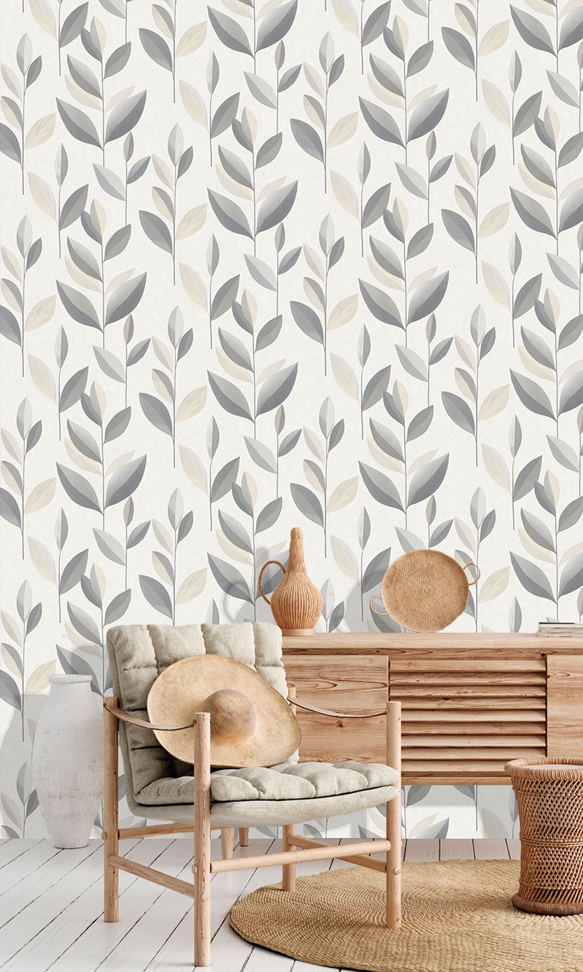 Mountain Mist & Nickel Stylized Plum Leaf Wallpaper R9942