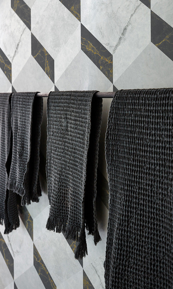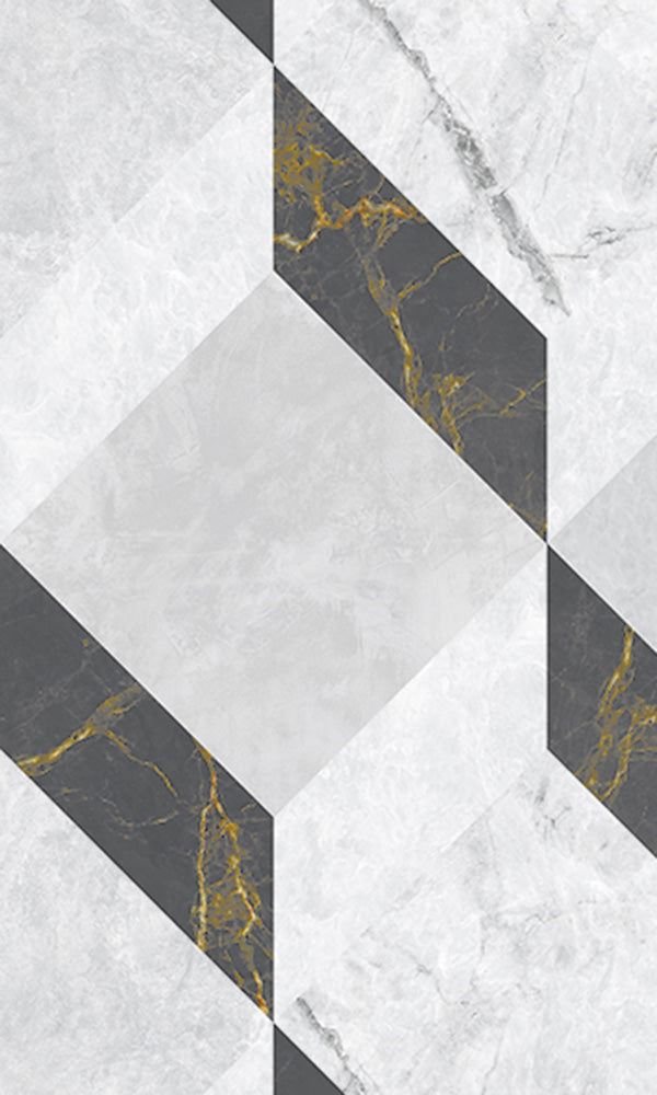 This geometric wallpaper features 3 dimensional cubes overlaid with a concrete and marble effect. One side of each cube features a black fill with an artistic gold detail running through it. As the shapes stack on top of each other, they form an illusory and contemporary design.