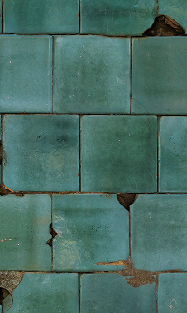 This faux effect wallpaper features a highly realistic ceramic tile pattern. Scratches and other marks appear to give some tiles a worn appearance, while other tiles are cracked and broken entirely. This wallpaper is printed on the Pearl substrate for a glossy effect that gives the authenticity of real tile.