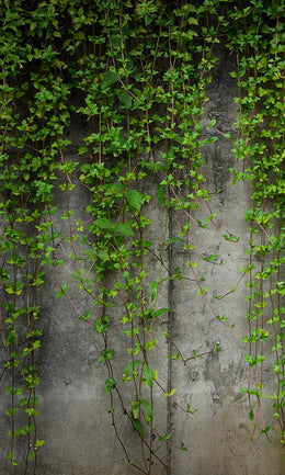 This wallpaper mural features a twist on the popular concrete wall design. Lush green ivy hangs down from the top of the wall, mixing industrial and nature elements for a refreshing and interesting look.