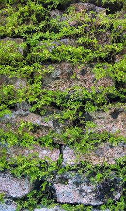 Moss and leafy foliage climb through the cracks in a stone wall. The mix of lush nature and urban elements creates a refreshing wallpaper mural design perfect for an office or lobby.