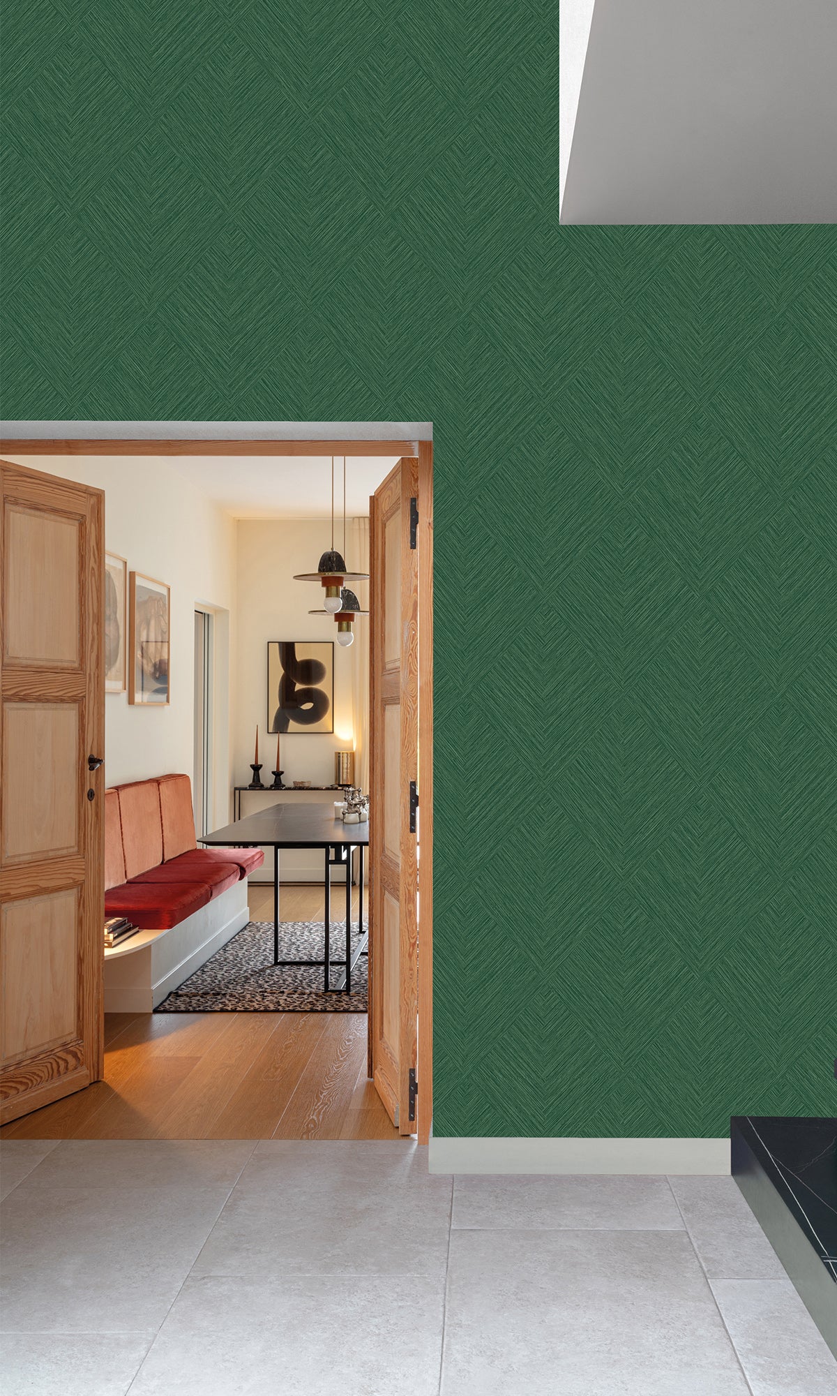 Reimagine your space with the warm, inviting charm of Tiled Basketweave Wallpaper. This textured wallpaper features strips of flattened grass blades intricately woven together in a beautiful diamond pattern, recreating the cozy yet elegant feel of a tropical home.