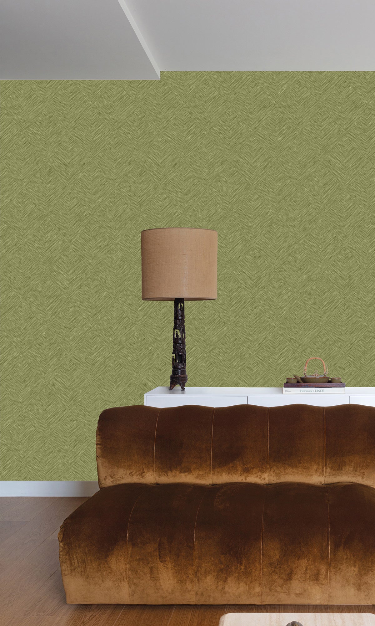 Reimagine your space with the warm, inviting charm of Tiled Basketweave Wallpaper. This textured wallpaper features strips of flattened grass blades intricately woven together in a beautiful diamond pattern, recreating the cozy yet elegant feel of a tropical home.