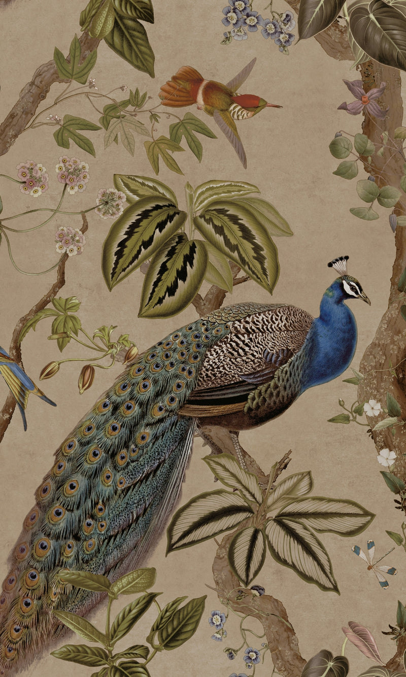 Taupe Climbing Peacock & Climbing Florals Tropical Wallpaper R8987