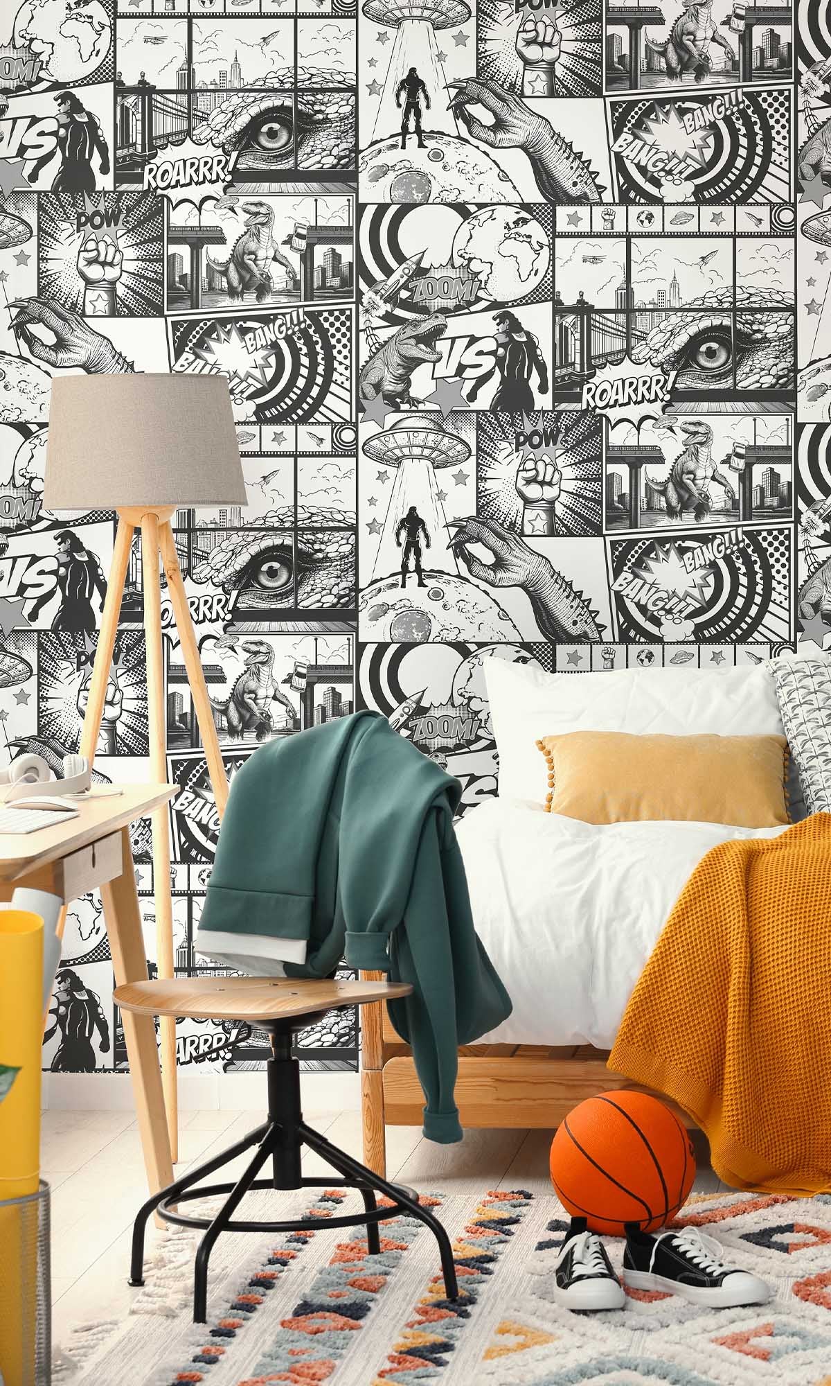 This isn’t just for kids—unless you count your inner child (who’s probably doing backflips right now). Playrooms, bedrooms, secret superhero lairs—whatever you’ve got, this wallpaper turns it into a comic strip straight off the page.