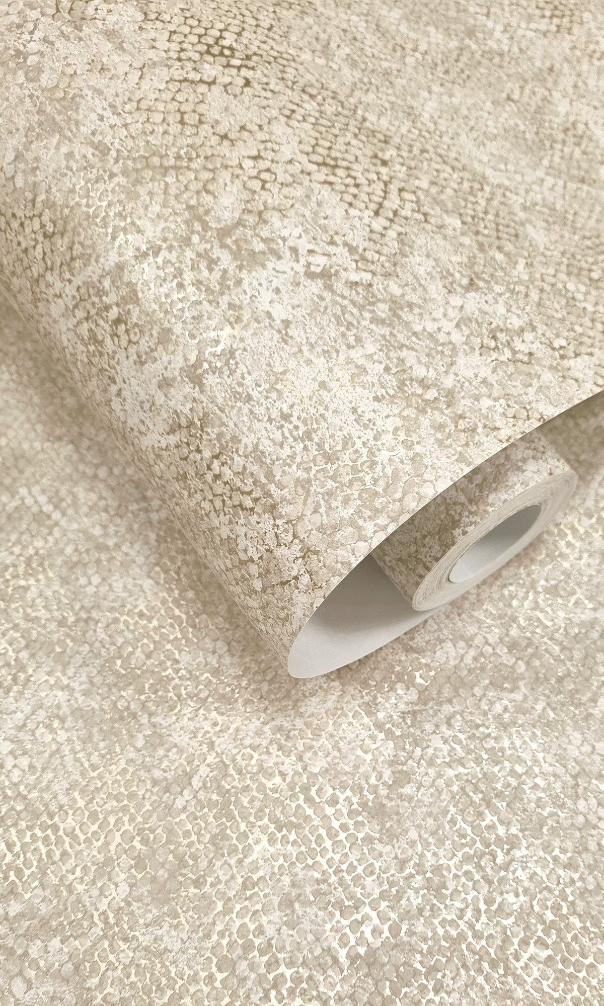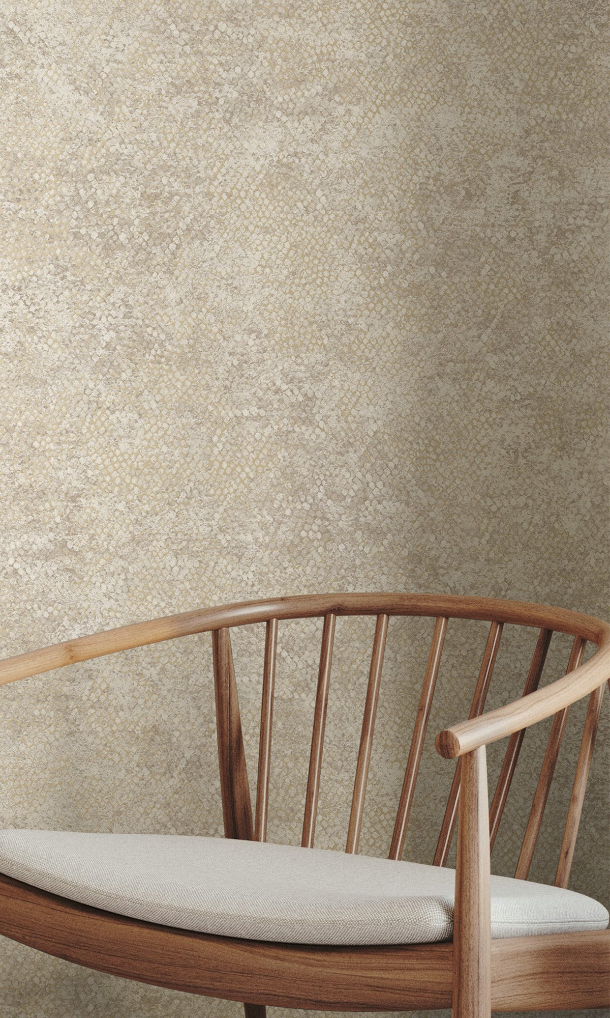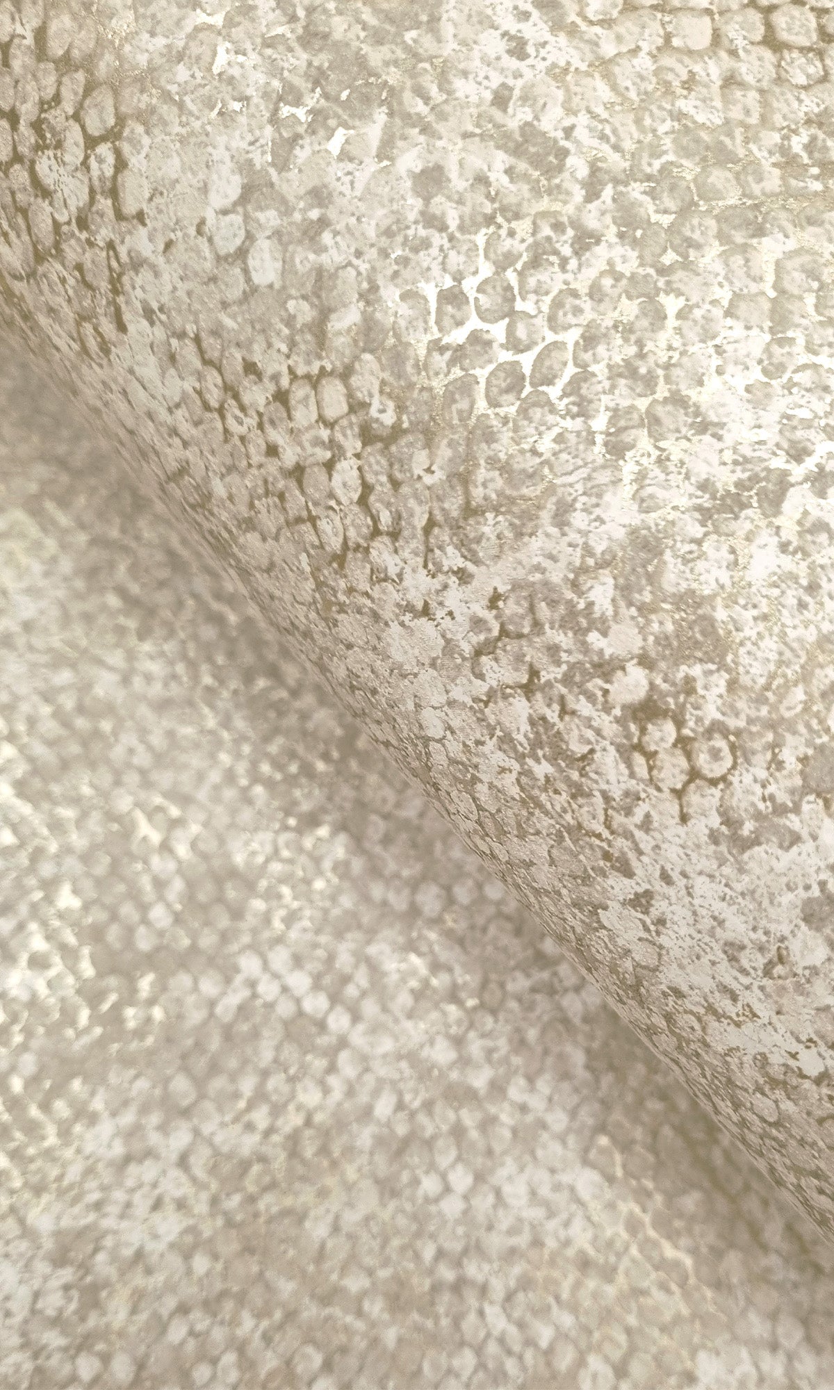 This luxurious wallpaper features a mesmerizing scale-like metallic pattern that adds depth and sophistication to any space. The raised surface of our Faux Snakeskin Textured wallpaper enhances the tactile experience, creating a striking interplay of texture and light.
