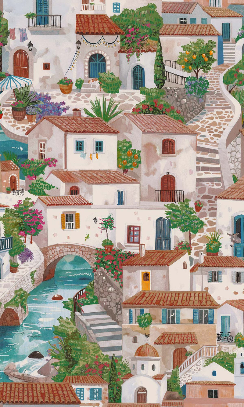 Multi Painted Mediterranean Village Wallpaper R10249