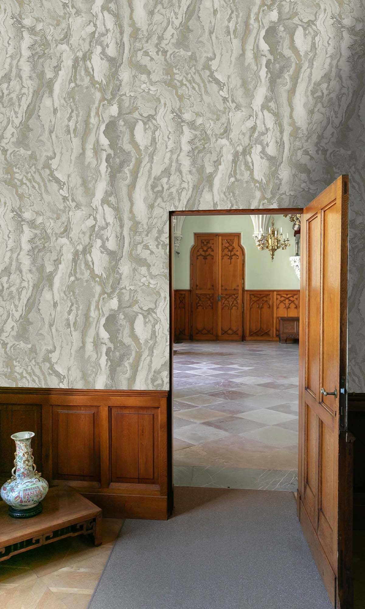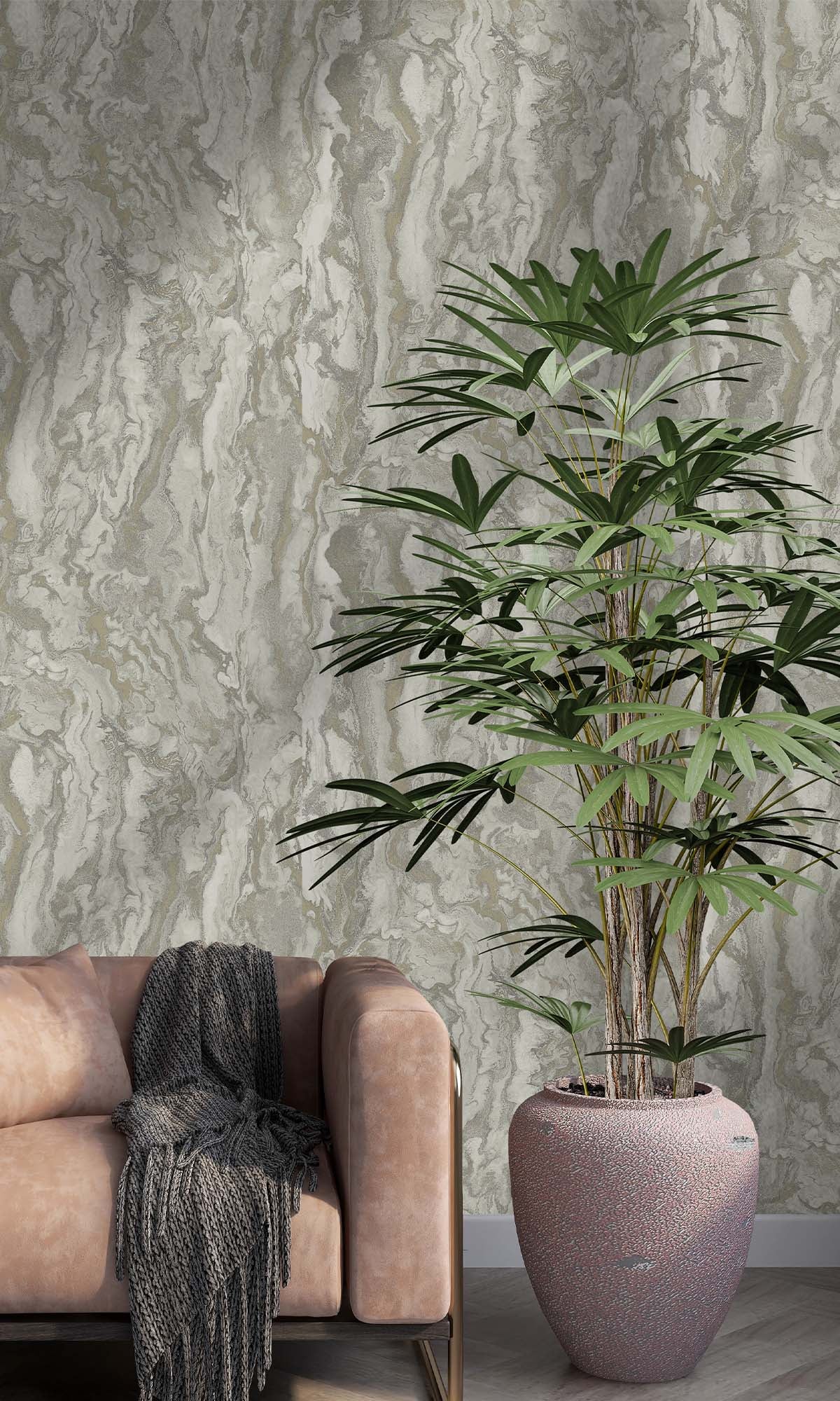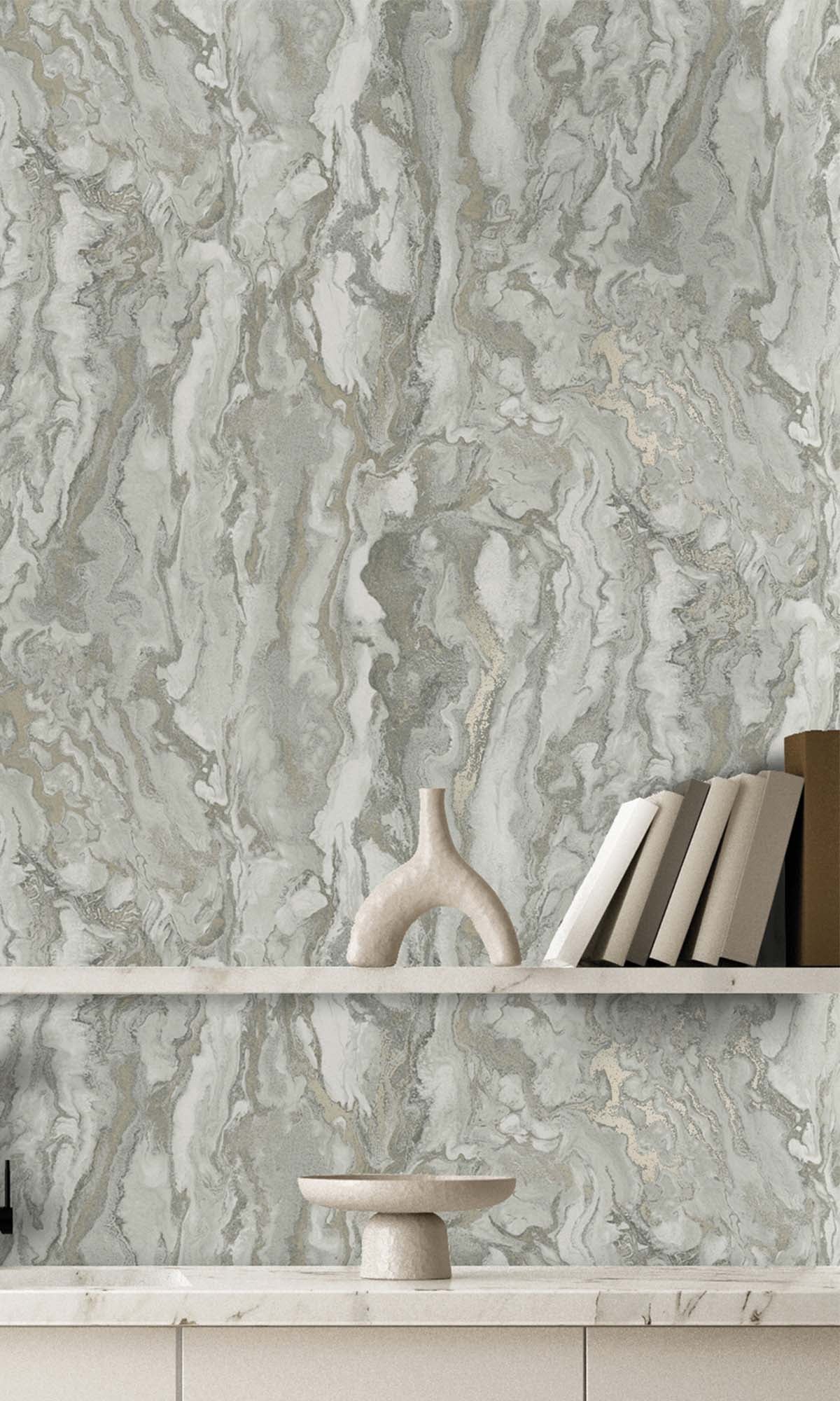 This wallcovering draws you in with its marble-inspired look, but there’s more going on once you get closer. Metallic highlights catch the light just right, and the raised acrylic textures feel as good as they look—almost like you’re running your hand over carved stone. The layers create real depth, so it’s not just flat and pretty; it has some presence, almost architectural.