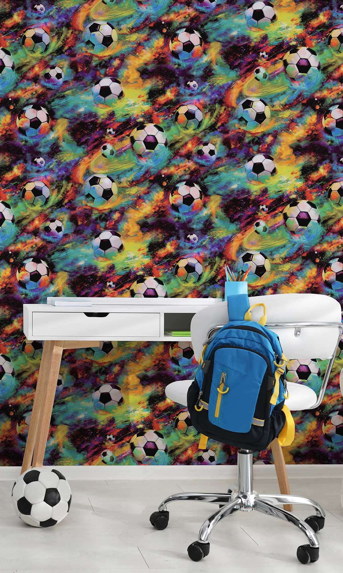 Ever wished your kid’s room looked like Messi scored a hat trick… on Mars? Meet the Football Galaxy Wallpaper. It’s wild—picture footballs just floating around in a neon galaxy, stars everywhere, like the Champions League in outer space. Perfect for kids who can’t decide if they wanna be Ronaldo or an astronaut (or both—hey, dream big).