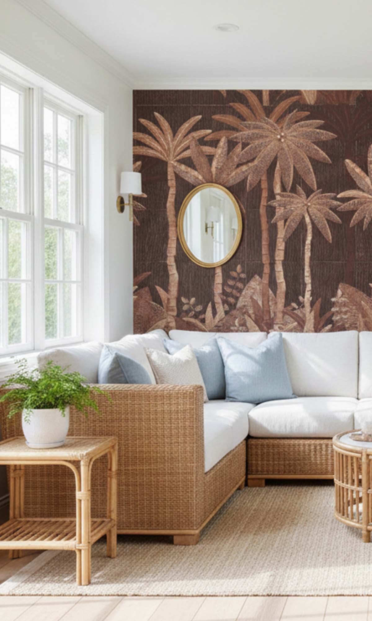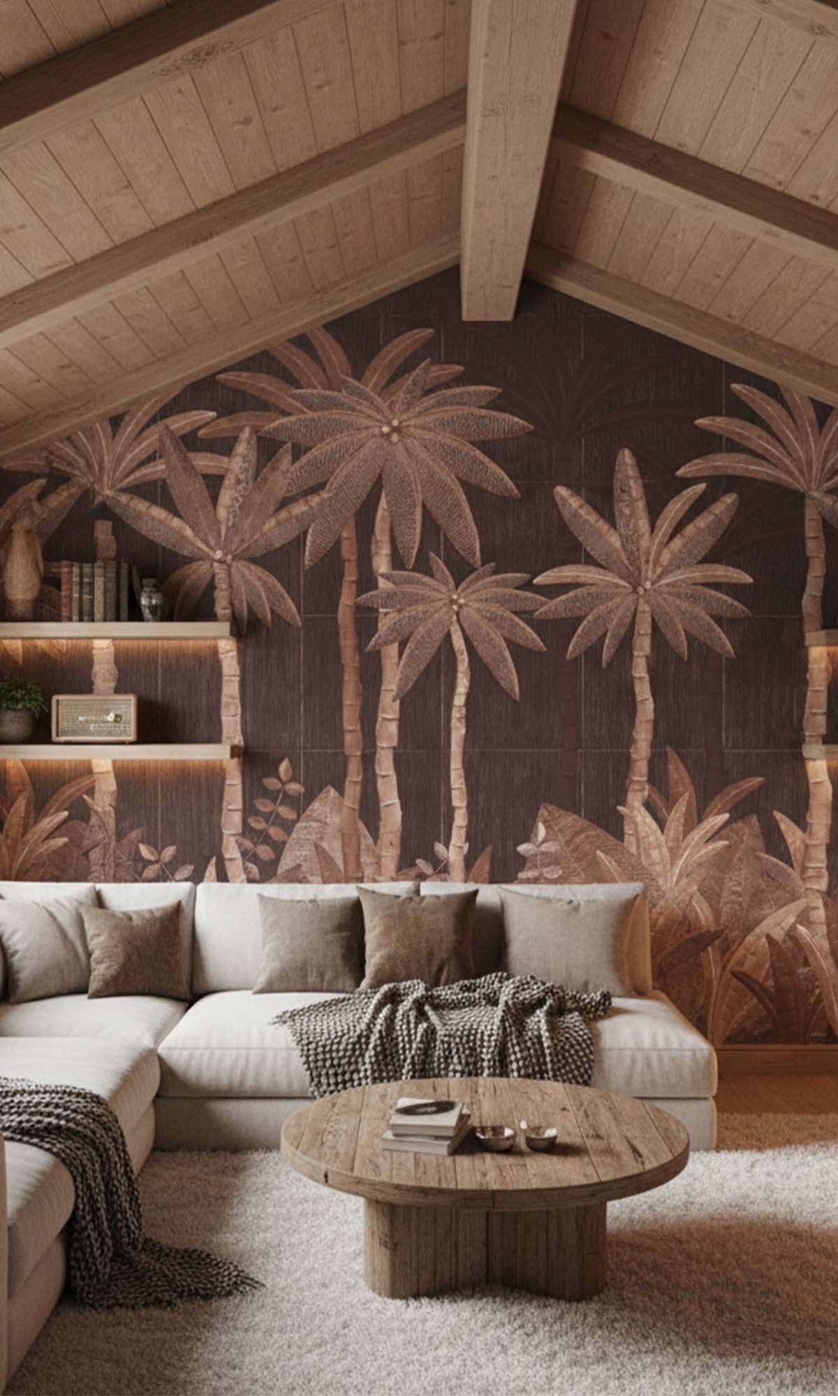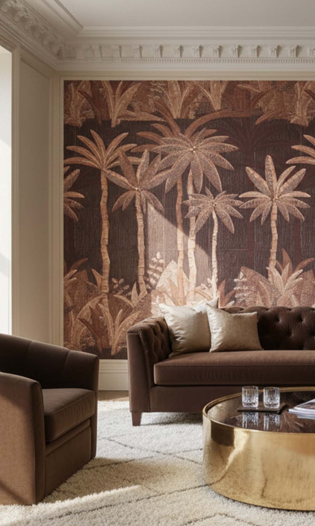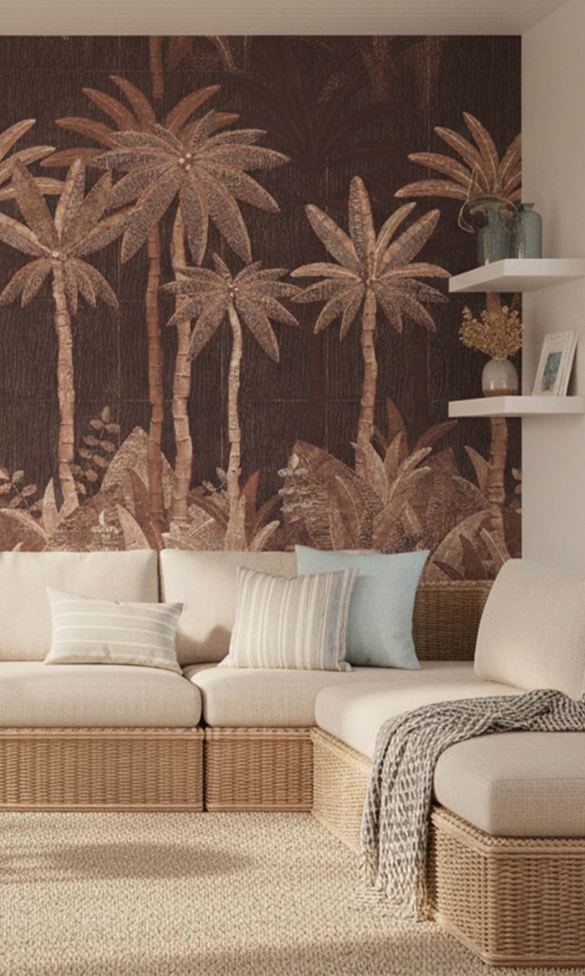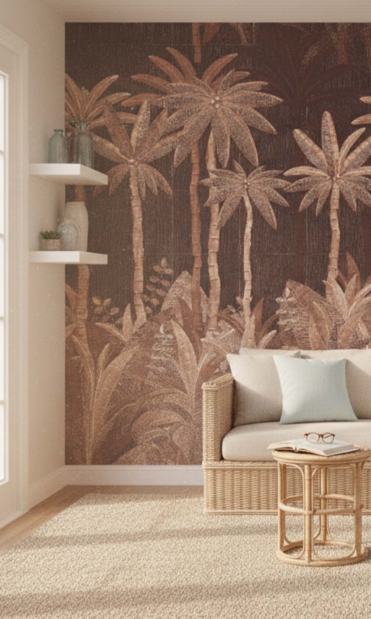 Wanna make a statement? This Tropical Palm Leaf mural doesn’t just sit quietly on your wall—it practically leaps out at you. We're talking big, bold jungle vibes—towering palm trees, thick layers of green, all that good stuff. The dark background really cranks up the drama, while those lighter palms pop like they’re catching a spotlight. It’s got that luxe, moody thing going on, like you just stepped into a boutique hotel in Bali.