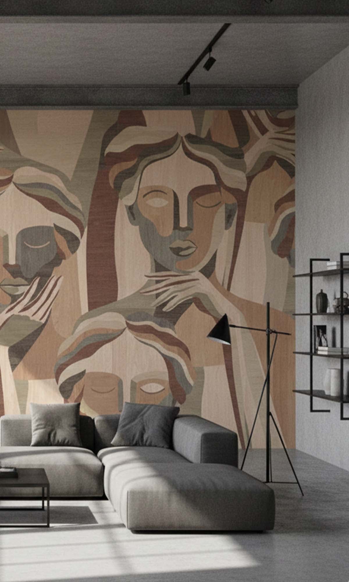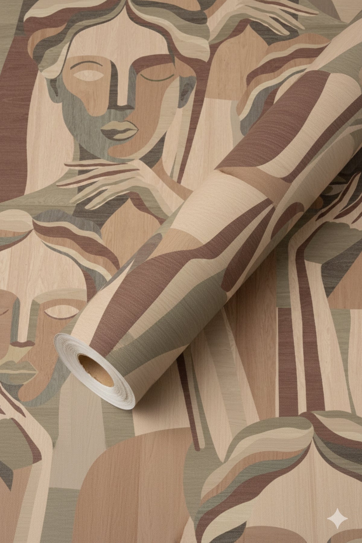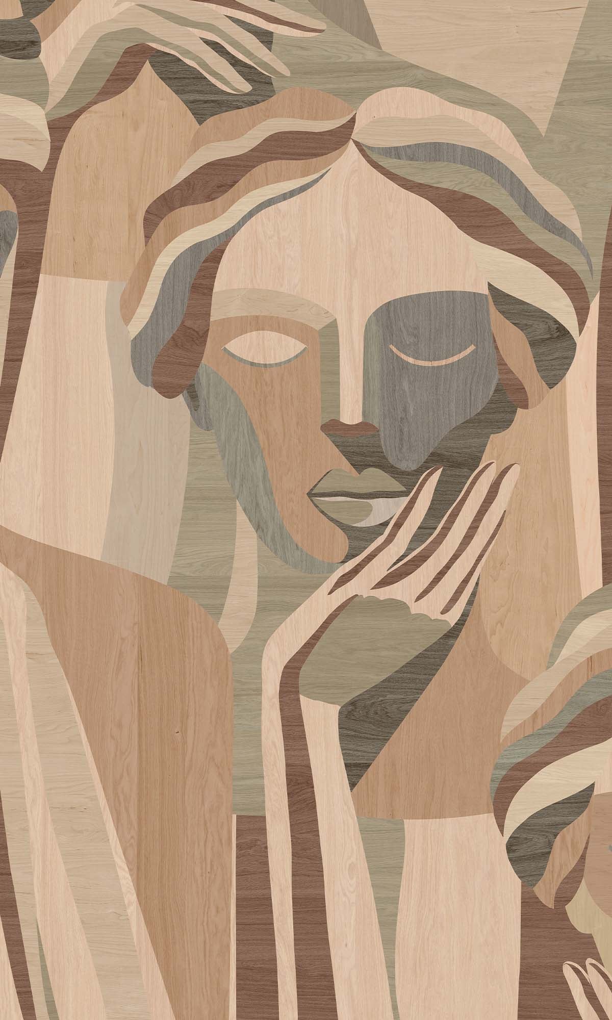 Make a real statement with this Modern Marquetry mural wallpaper. It's bold, dramatic, and anything but ordinary. You’ll spot fragmented faces and hands—stylized, almost dreamlike—echoing the spirit of early Cubism, but with a fresh, modern twist.