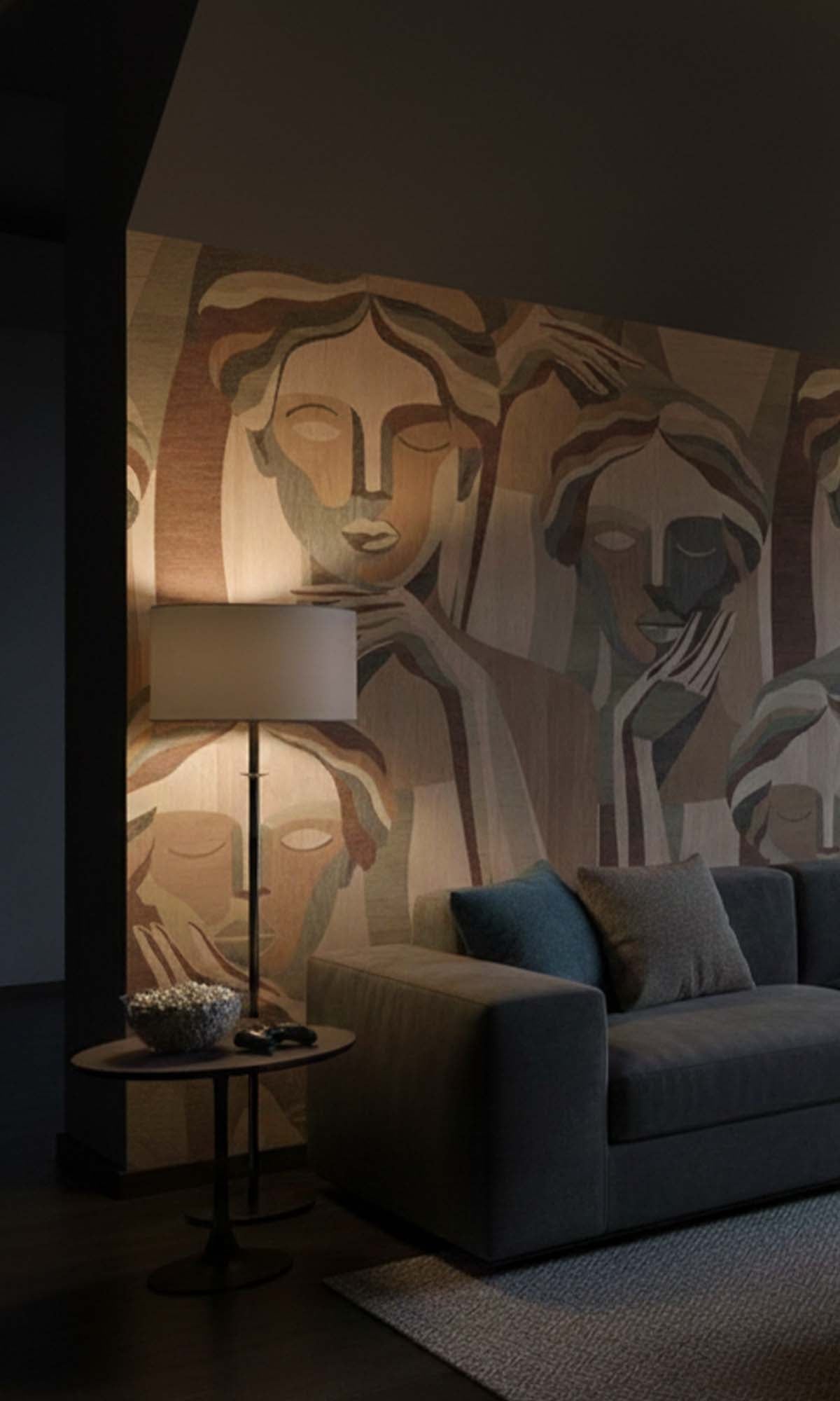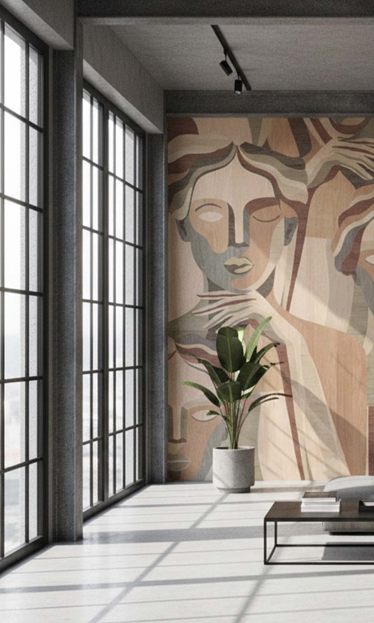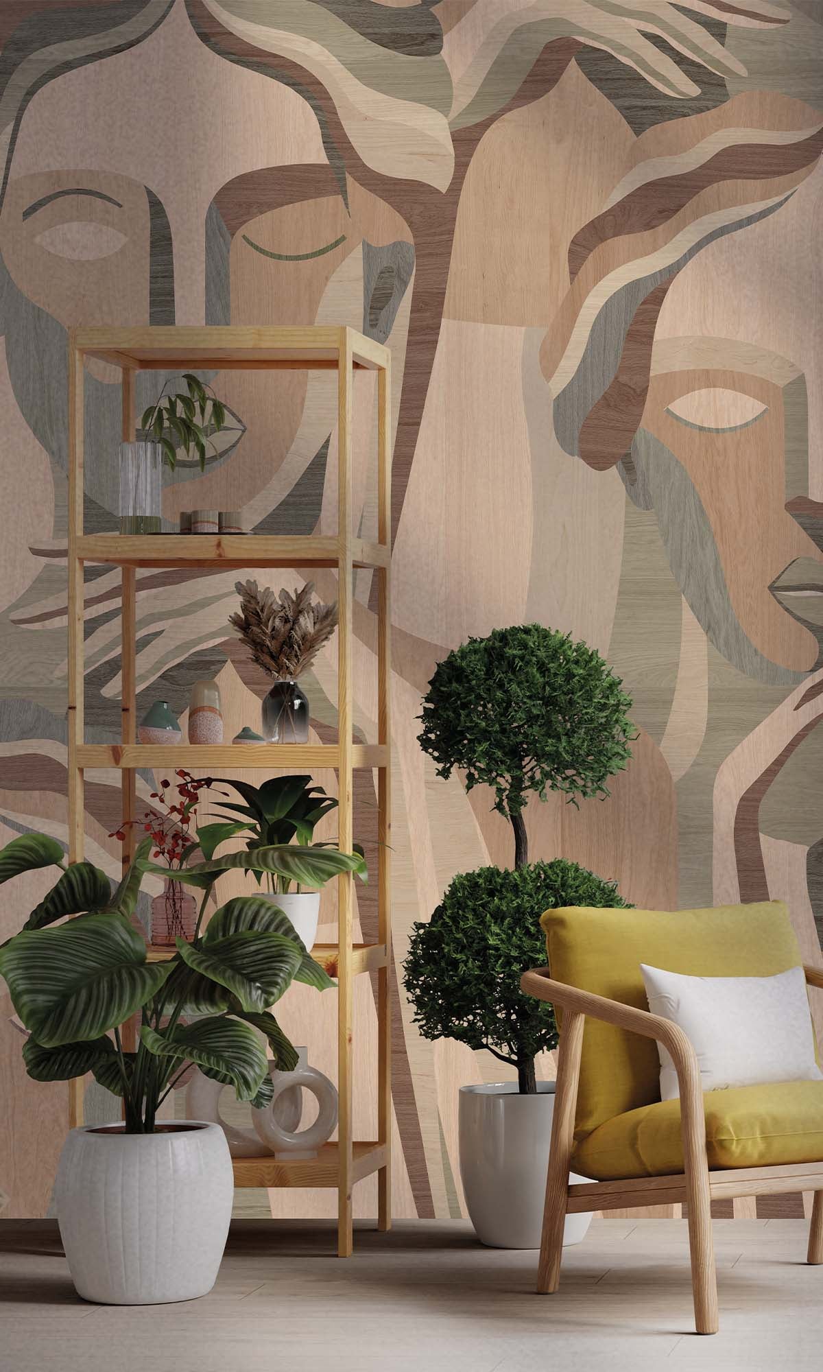 Make a real statement with this Modern Marquetry mural wallpaper. It's bold, dramatic, and anything but ordinary. You’ll spot fragmented faces and hands—stylized, almost dreamlike—echoing the spirit of early Cubism, but with a fresh, modern twist.